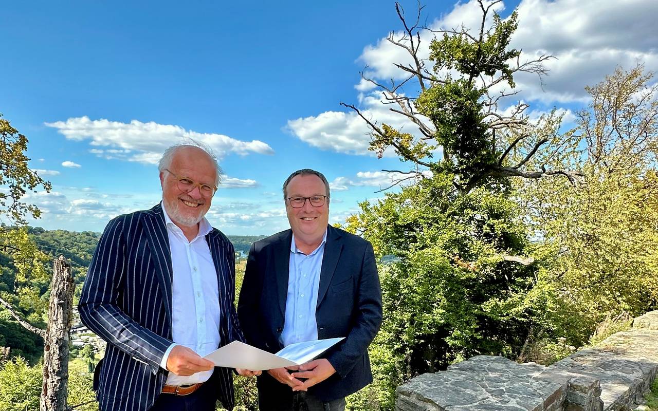 Die Stadt Hattingen freut sich über eine Finanzspritze: Landesverkehrsminister Oliver Krischer hat den Förderbescheid kürzlich auf der Isenburg an Bürgermeister Dirk Glaser übergeben.