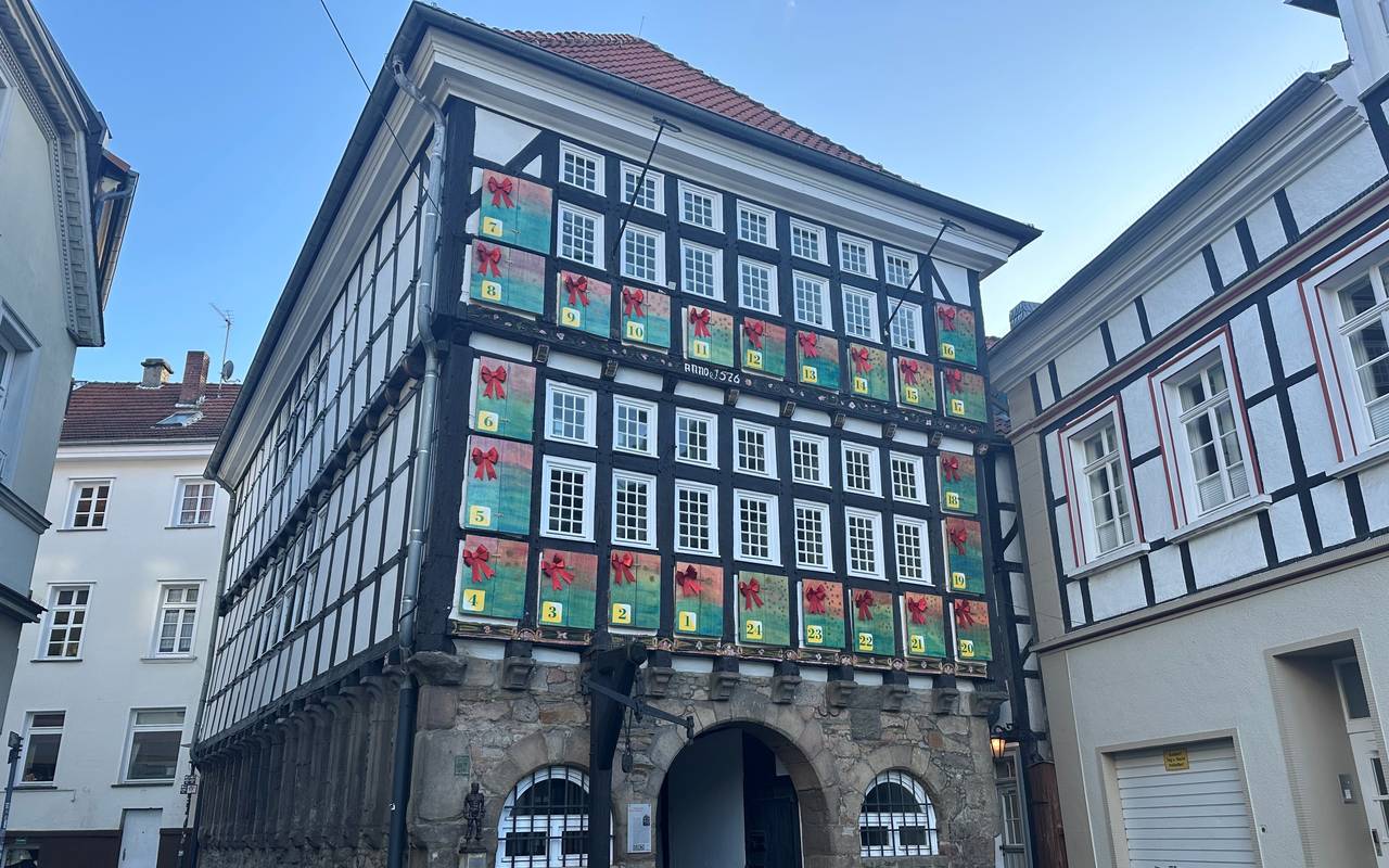 800 Meter Lichterkette schmücken in den kommenden Wochen die Hattinger Innenstadt. Die wickeln sich um die acht Weihnachtsbäume, die die technischen Betriebe in der Innenstadt aufstellen. Pro Baum, der sieben Meter hoch ist, bringen die Mitarbeiterinnen und Mitarbeiter rund 100 Meter Lichterkette an. Auch der Adventskalender mit Frau Holle ist angebracht. Die Türen und Schleifen sind nach rund 40 Jahren erneuert worden, jetzt sieht alles wieder etwas frischer aus.