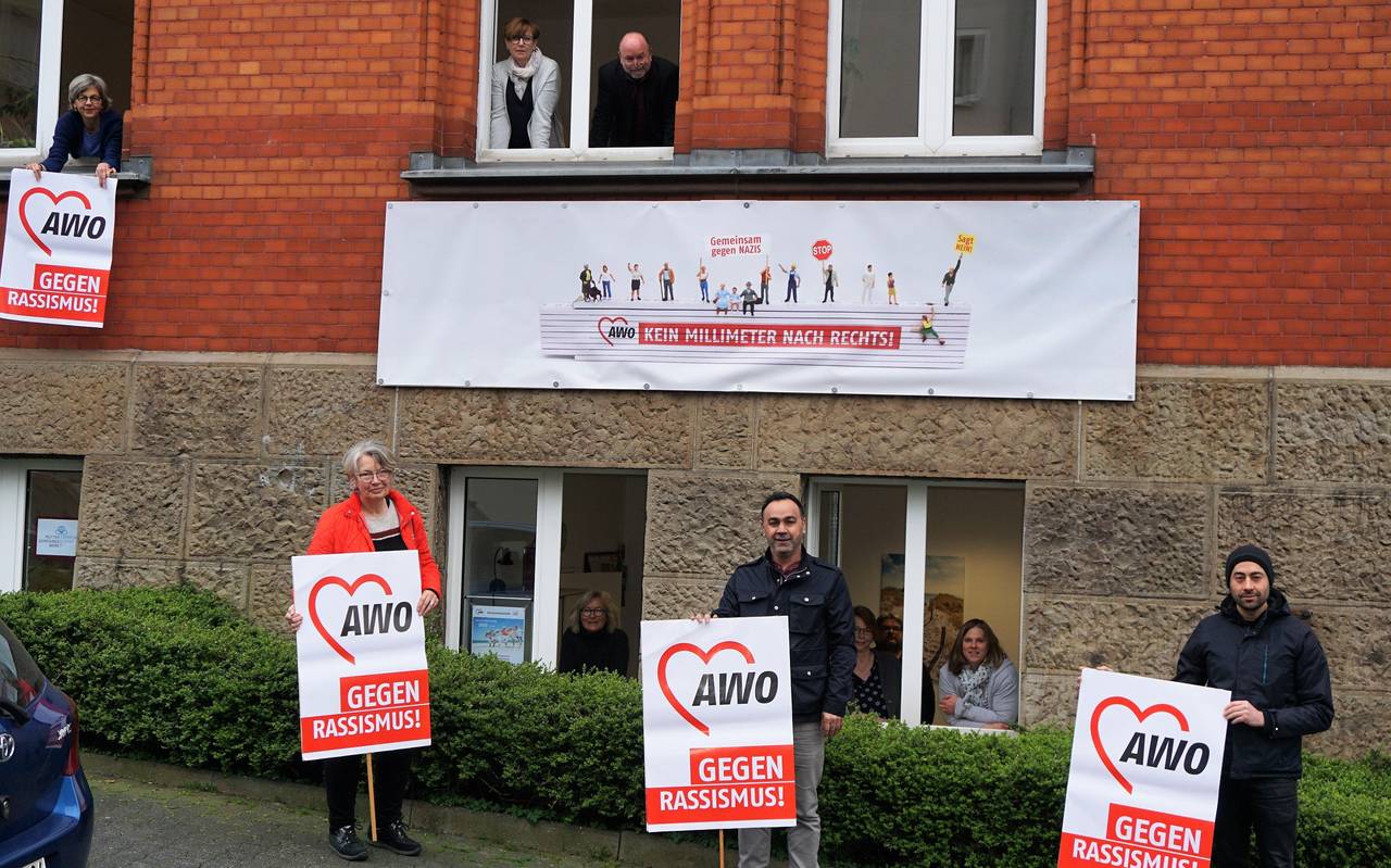 Stattdessen haben sich AWO-Mitarbeiter am Tag der abgesagten Veranstaltung mit großem Abstand zueinander vor der Gevelsberger Arbeiterwohlfahrt-Geschäftsstelle und an den Fenstern versammelt. Dort haben sie unter anderem ein großes Banner gegen Rassismus ausgerollt.