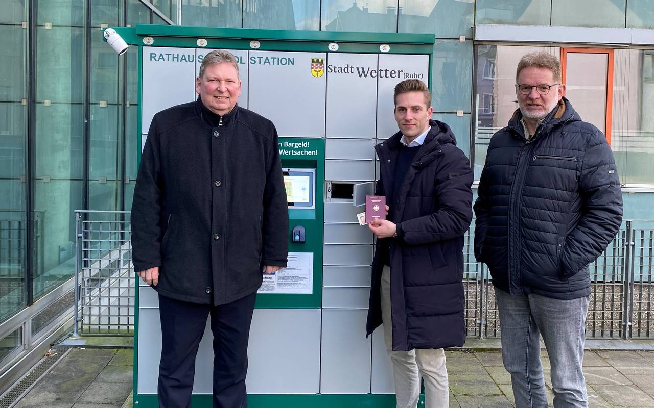 Eine Innovative Idee ist jetzt in Wetter umgesetzt worden. Am Rathaus in der Kaiserstraße steht nun eine Abholstation für Dokumente - wie etwa Personalausweise und Reisepässe. Zukünftig sollen auch Fundsachen abgeholt werden können. Die Station ist rund um die Uhr zugänglich, die Bürgerinnen und Bürger sind so nicht mehr an die Öffnungszeiten des Bürgerbüros gebunden. Die Benutzungsanleitung auf der Internetseite der Stadt Wetter ist hier einsehbar.