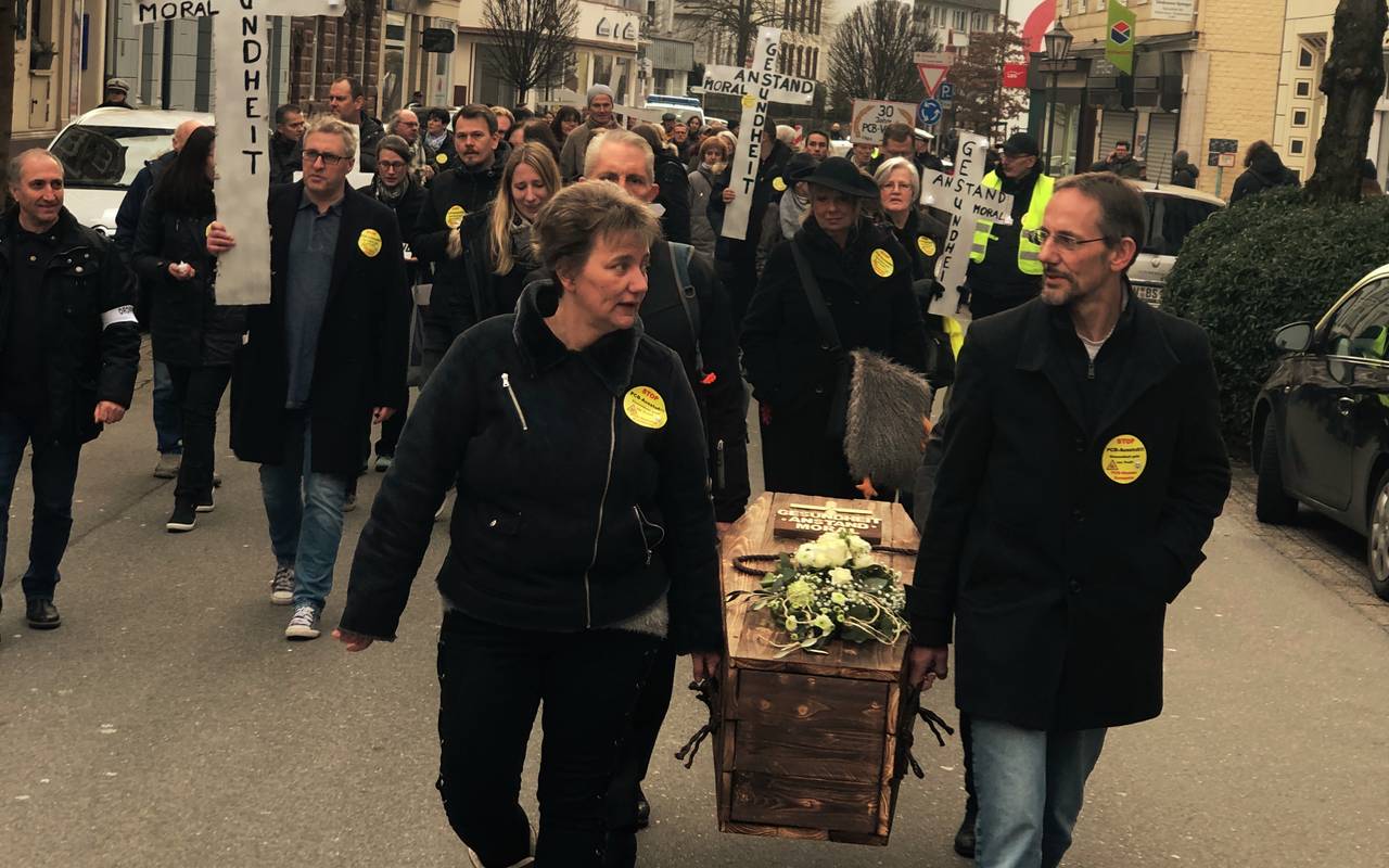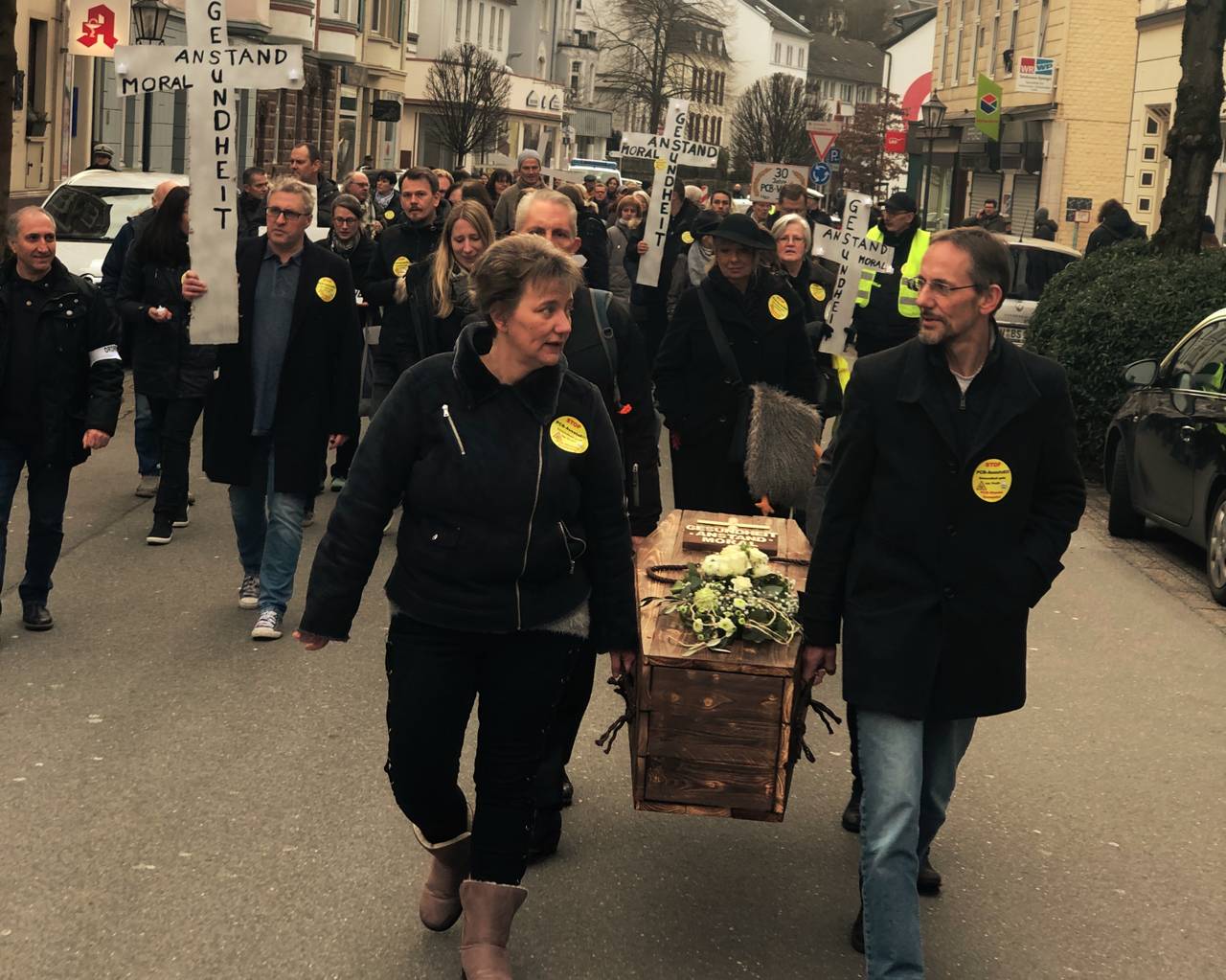 Vor der Versammlung gab es einen Trauermarsch durch die Stadt, organisiert von der Bürgerinitiative "PCB-Skandal Ennepetal". Rund 60 Menschen sind durch die Stadt gezogen, viele schwarz gekleidet und mit weißen Pappkreuzen in der Hand. Sie wollten so ein Zeichen in Richtung der Firma BIW und der Behörden setzen.