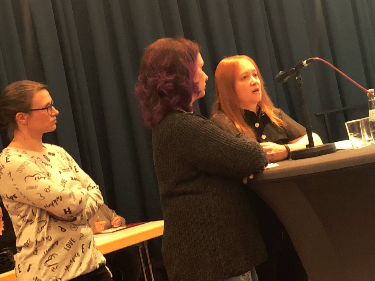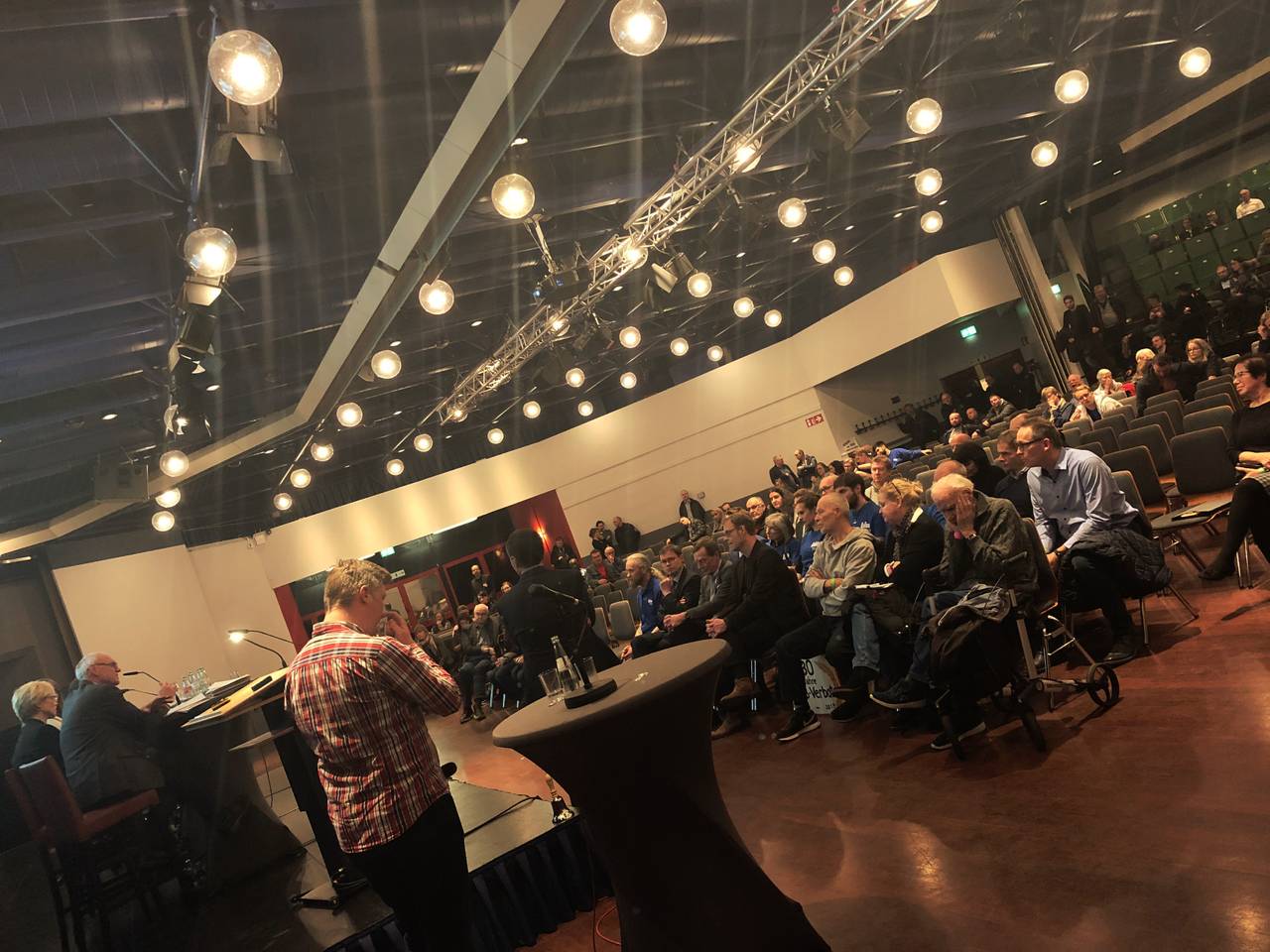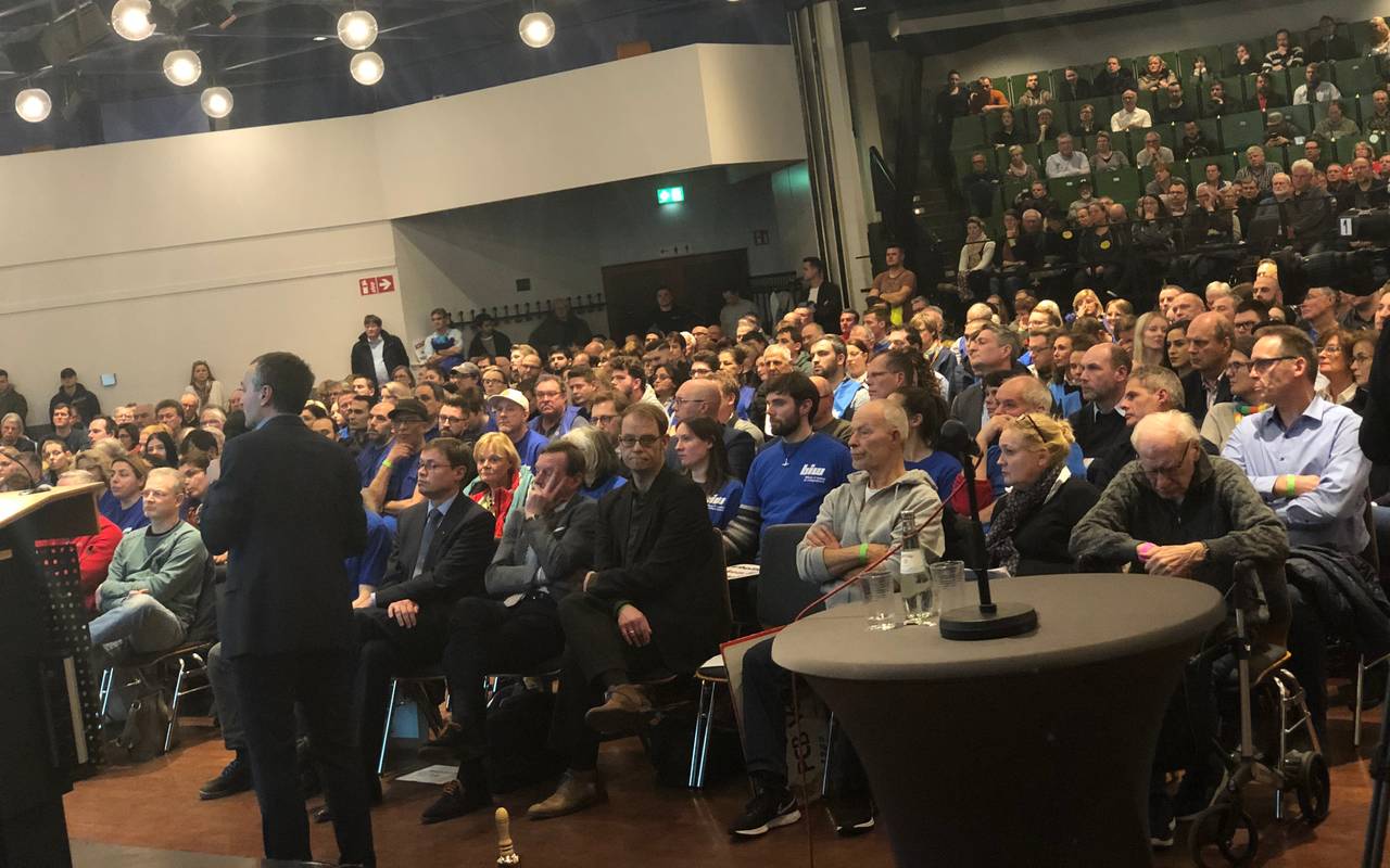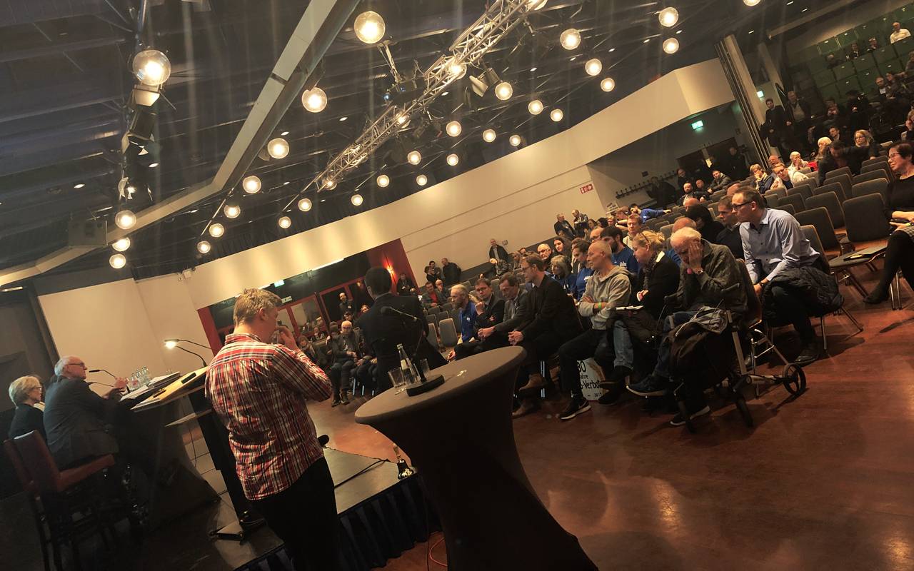 Das Haus sei bis auf den letzten Platz ausgelastet gewesen, sie habe eben am Einlass entscheiden müssen, dass fünfzig weitere Zuhörer eingelassen werden. Andernfalls hätte es eine Eskalation vor der Tür gegeben. Mittlerweile seien einige Besucher gegangen, sodass jetzt wieder Plätze frei sind.