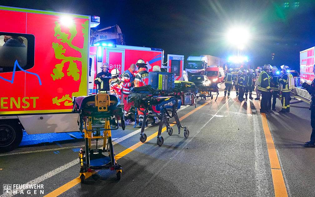 Ein Lkw-Fahrer hat gestern bei einer Chaosfahrt auf Autobahnen zwischen Neuss und Gevelsberg zig Autos gerammt und dabei zahlreiche Menschen verletzt. Laut Polizei Düsseldorf schwebt aktuell eine Person in Lebensgefahr, acht weitere wurden schwer, 18 leicht verletzt. Der Sattelzug mit polnischen Kennzeichen war gestern Nachmittag auf der A46 in Neuss mit rücksichtsloser Fahrweise aufgefallen. Die Polizei konnte den Lkw nicht stoppen. Auf seiner Fahrt über die A46 und ab Kreuz Wuppertal-Nord über die A1 Richtung Bremen rammte er etliche Autos und geriet zwischen Volmarstein und Hagen-West in den Gegenverkehr.Dort endete die Fahrt. Bislang sind der Polizei 50 beschädigte Fahrzeuge bekannt. Der Lkw-Fahrer wurde festgenommen.Die A1 ist zwischen Hagen-West und Gevelsberg voraussichtlich bis Sonntagmittag in beide Richtungen gesperrt.