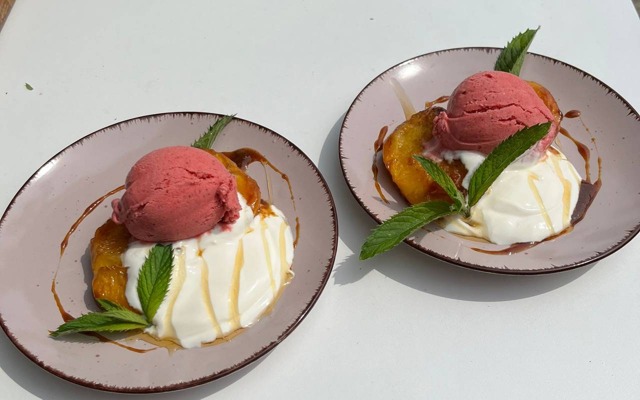 Gegrillte Pfirsichhälften an Naturjoghurt und Erdbeereis
