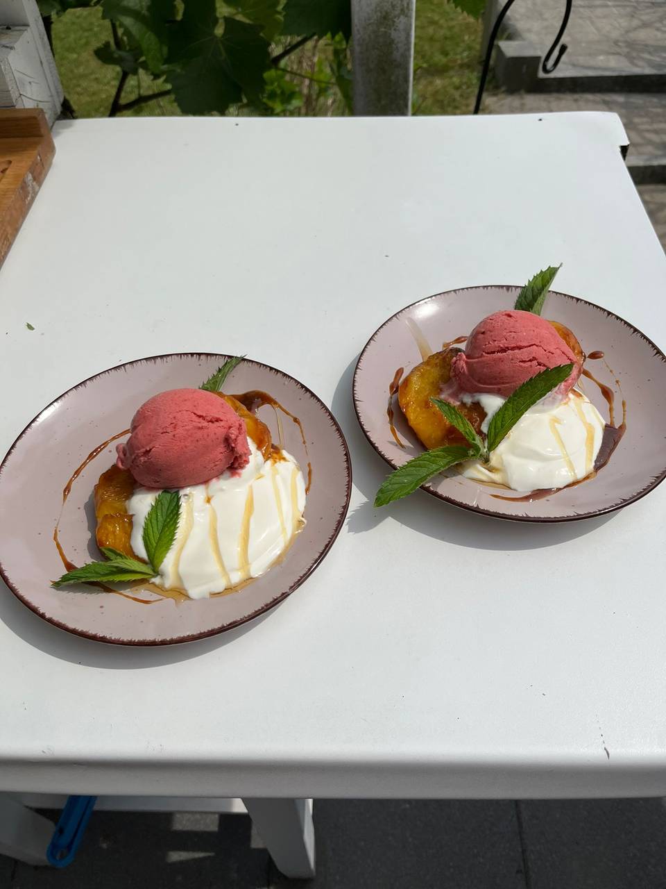 Nun die Pfirsichhälften auf einen Teller setzen und mit dem Naturjoghurt garnieren. Mit einem Esslöffel Honig nappieren und eine Kugel Erdbeereis drauf setzen. Mit Minze garnieren und Puderzucker abstäuben.