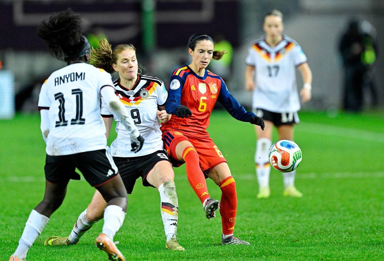 Entzaubert: Spaniens Weltfußballerin Aitana Bonmatí (in Rot).© Uwe Anspach/dpa