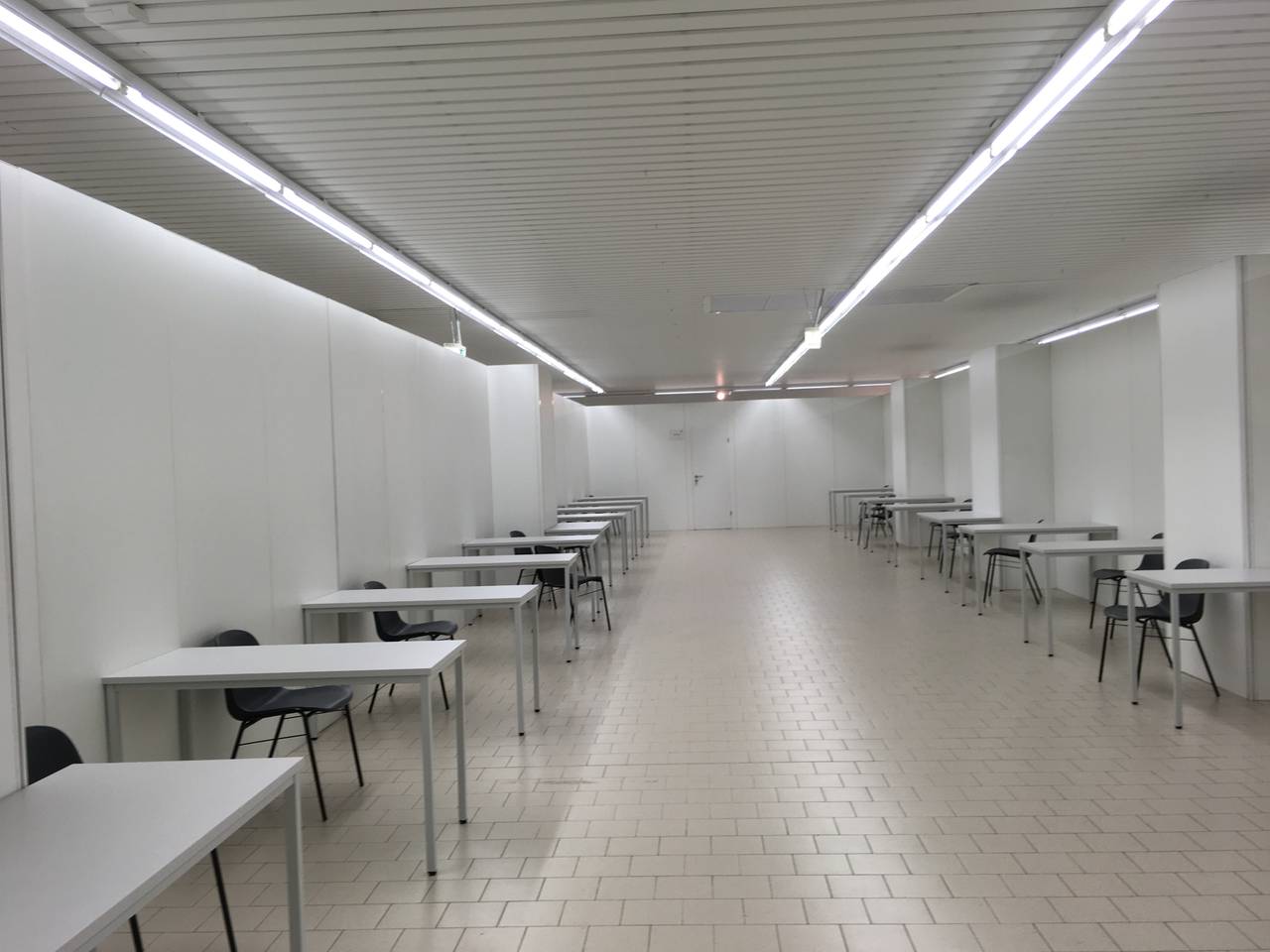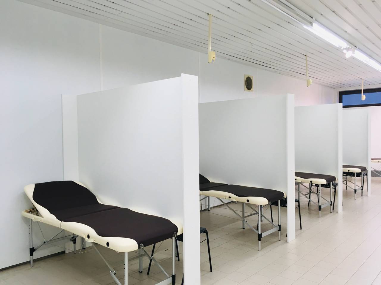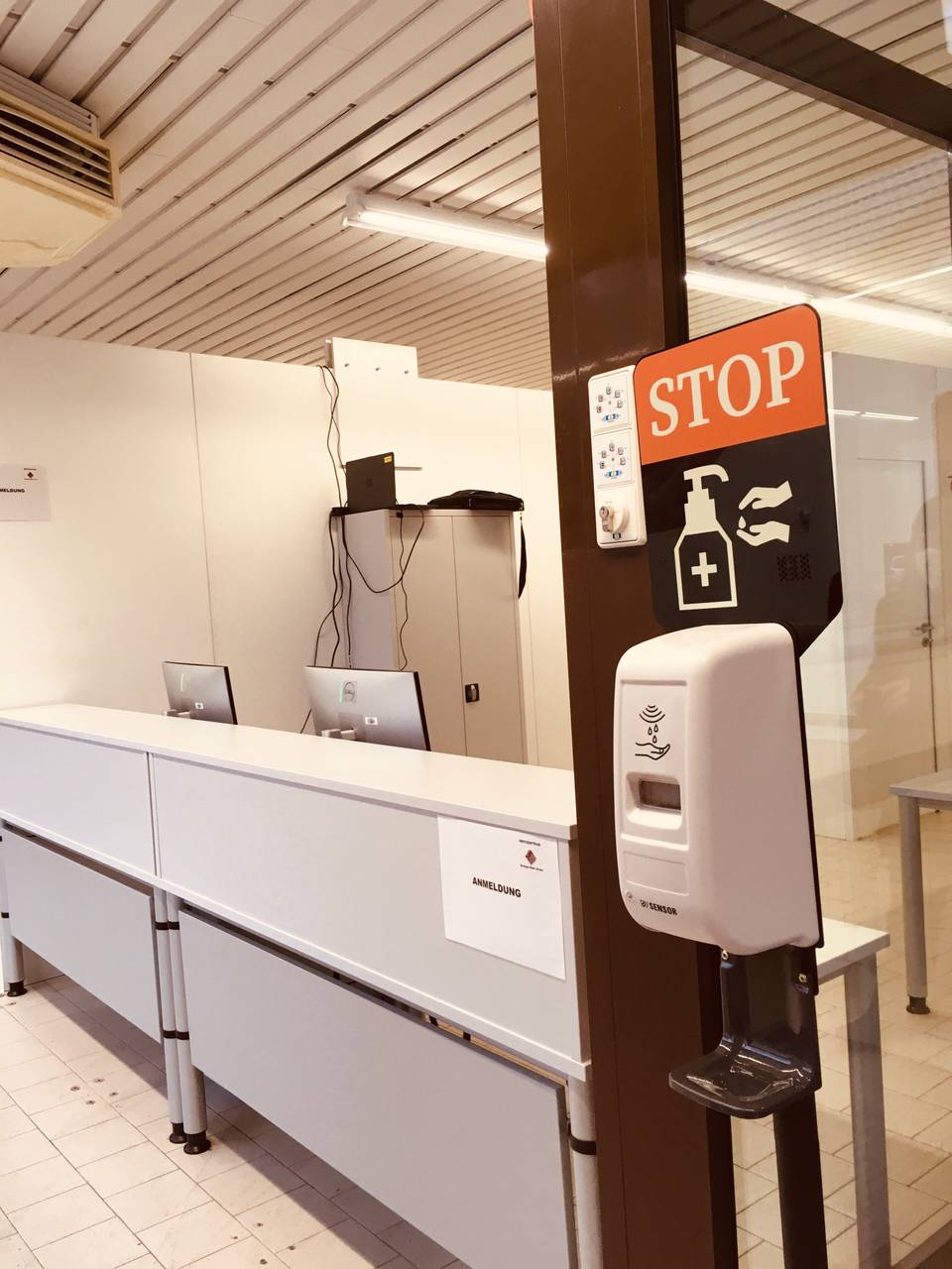 Wer einen Termin hat, meldet sich am Empfang, desinfiziert sich die Hände und nimmt im Wartebereich Platz. Auf Bildschirmen wird dort schon erklärt, was auf die Patienten wenig später zukommt. Wer aufgerufen ist, verschwindet hinter einer der Türen zu den Impfstraßen. In der ersten Kabine sitzt ein Arzt, der im persönlichen Gespräch über die Impfung und mögliche Risiken aufklärt. Eine Tür weiter kommt man in das eigentliche Impfzimmer. Dort verabreicht geschultes Personal die Impfdosis. Gleich nach dem Nadelstich geht es wieder eine Tür weiter in den Beobachtungsbereich. Dort stehen Stühle, Tische und auch Liegen. Hier werden die Patienten, wie nach jeder Impfung, noch eine Weile beobachtet, falls Kreislaufprobleme oder mögliche Nebenwirkungen auftreten. Danach geht es durch einen separaten Ausgang wieder hinaus auf den Parkplatz.