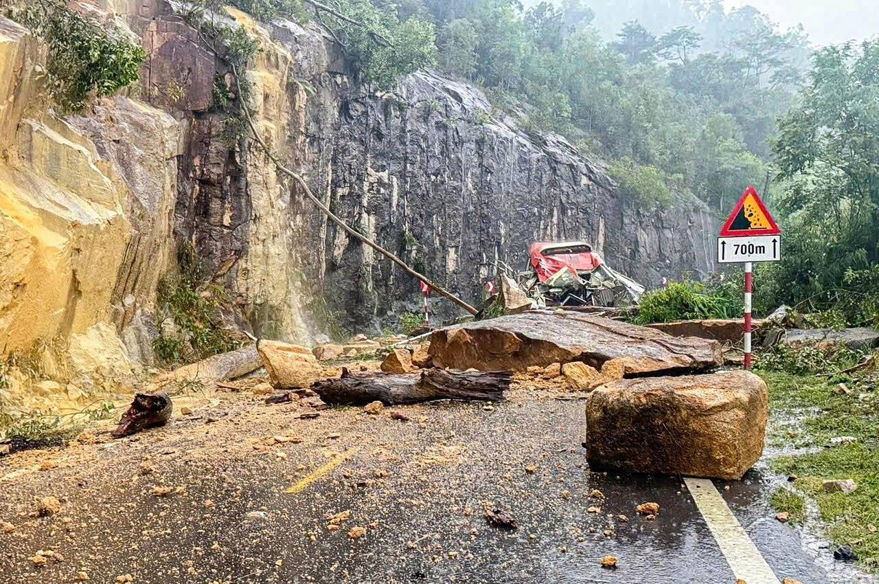 Schwere Felsbrocken und Gestein waren auf den Bus gestürzt.© Minh Bang/VNExpress via AP/dpa