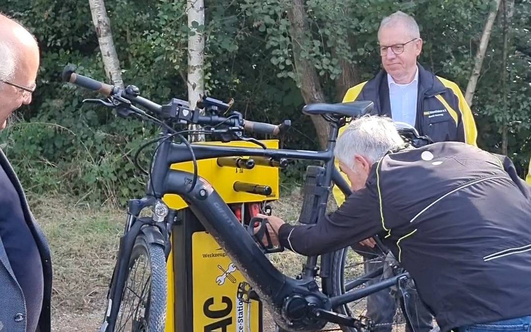 Der ADAC Westfalen stellt für ein Pilotprojekt zehn Radservicestationen auf. Die erste kam nach Sprockhövel. Sie steht an der Glückauf-Trasse bei der Pumptrack-Anlage. Damit kann man sein Fahrrad kostenlos warten und reparieren, zum Beispiel bei einer Panne.