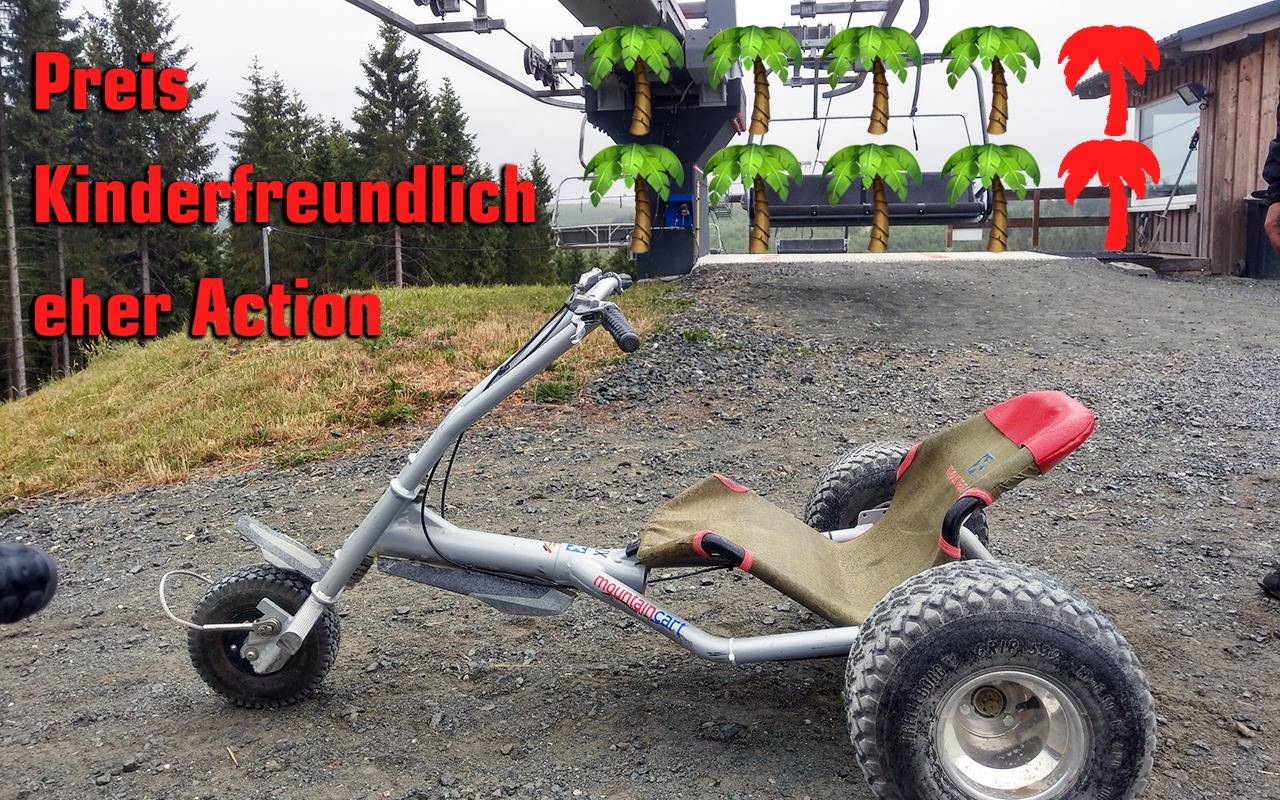 In Winterberg kann man Kart fahren. Allerdings nicht in einer Halle, sondern einen Berg runter. Einen Motor haben die Karts auch nicht. Da reicht die Schwerkraft, um einen die knapp dreihundert Meter lange Piste runter zu bringen. Eine Fahrt kostet 3 Euro dauert aber nicht allzu lange. Deswegen lohnt sich durchaus das 10er-Ticket. Hoch muss man übrigens nicht zu Fuß. Ein Skilift bringt einen wieder zum Start.
