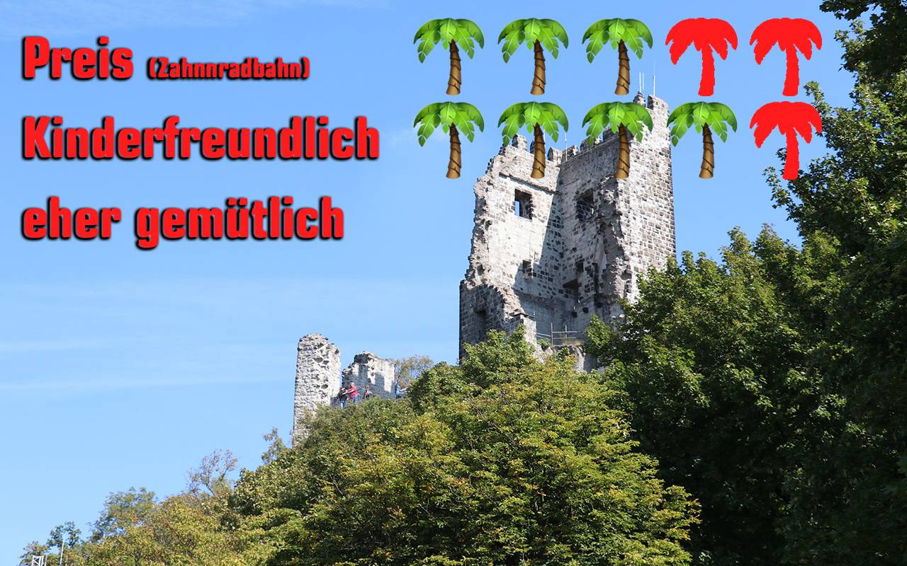 Er hört sich nach langer deutscher Geschichte an und ist eines der beliebtesten Ausflugsziele in NRW. Der Drachenfels am Rhein in Königswinter. Ein Berg mit einer Schlossruine und auf den man auch mit der Zahnnradbahn kommt. Wer es lieber sportlich mag, kann auch zu Fuß den Berg hoch. Dann sollte man aber mehr Zeit und feste Schuhe einplanen. Die Ruinen sind vor allem für jüngere Kinder spannend. Ältere könnten sich etwas langweilen. Die Fahrt mit der Zahnradbahn koste für Erwachsene 10 Euro und für Kinder 5,50 Euro. Alternativ können in den Ferien Kinder aber auch mit dem Esel nach oben. Das kostet dann 15 Euro.