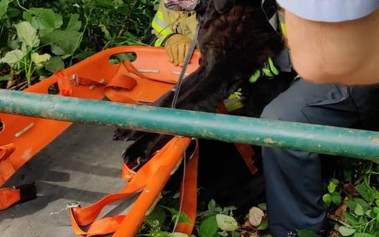 Die Feuerwehrleute kletterten den Abhang hinunter und retteten den Labradormischling mit einer Schleifkorbtrage. Der Hund hatte sich auch leicht verletzt. Die Einsatzkräfte brachten ihn zu einem Wittener Tierarzt.