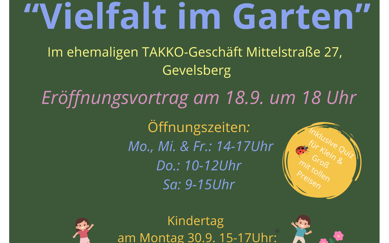 Mit einer gemeinsamen Ausstellung widmen sich die Stadt Gevelsberg und der NABU Ennepe-Ruhr zwei Wochen lang der Artenvielfalt. Dazu bauen sie im ehemaligen TAKKO-Ladenlokal im Erdgeschoss des Rupprecht-Hauses eine Ausstellung auf. Zentrales Modul ist die von der Natur- und Umweltschutz-Akademie NRW ausgeliehene Roll-Up-Ausstellung "Vielfalt im Garten". Es sind mehrere Aktionen mit Kindern geplant. Heute (18.09.) um 18:00 Uhr wird die Ausstellung offiziell eröffnet. Sie läuft bis zum 4. Oktober.