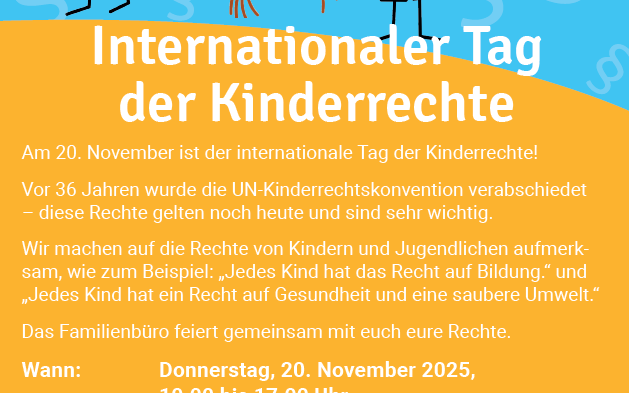Die Beschäftigten des Familienbüros feiern den Tag gemeinsam mit Kindern und Jugendlichen. Sie informieren über Kinderrechte und machen darauf aufmerksam, dass sie geschützt werden müssen. Von 10 bis 17 Uhr können sich Kinder und Jugendliche im Familienbüro (Hauptstraße 8a, 2.OG) eine kleine Überraschungstasche abholen.