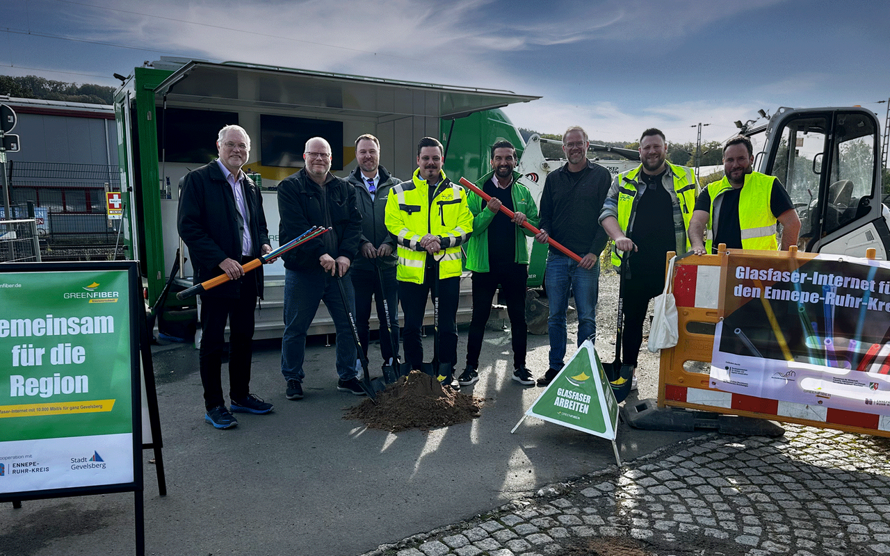 Auch in Gevelsberg laufen jetzt die Bauarbeiten zum Glasfaserausbau. Gestern (21.10.) gab es den ersten symbolischen Spatenstich. Die Arbeiten verantwortet das Unternehmen GREENFIBER, die Baumaßnahmen führt die Firma HT-Tiefbau durch. Insgesamt sollen gut 100 Adressen angeschlossen werden. Der Netzausbau erfolgt auch mit Fördermitteln von Bund und Land, Gevelsberg bekommt einen Zuschuss von rund einer Million Euro. Der Netzausbau soll vor allem die Zukunft von Unternehmen sichern. Aber es können sich auch Privathaushalte entlang der neuen Glasfaserstrecke Hausanschlüsse legen lassen.