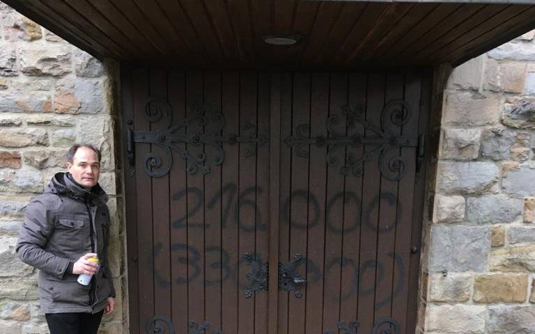 Ein Unbekannter hat eine Kirche in Sprockhövel mit Graffiti beschmiert, jetzt haben die Mitarbeitenden der Kirche selbst gesprayt. Seit Anfang Oktober stehen die Zahlen 216.000 und 330.000 auf der Kirchentür.