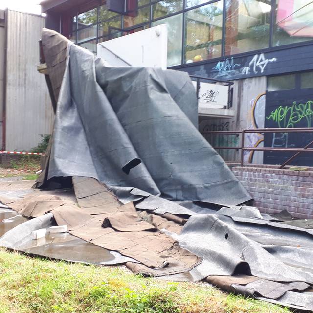 Wetter: Die Aufräumarbeiten nach dem Stumschaden sind noch im Gange. Eine Windbö hatte vergangene Woche ein großes Stück der Dachpappe vom Dach gerissen. Die musste zunächst entfernt werden, um zu untersuchen, ob die Fluchttreppe in Mitleidenschaft gezogen wurde.
