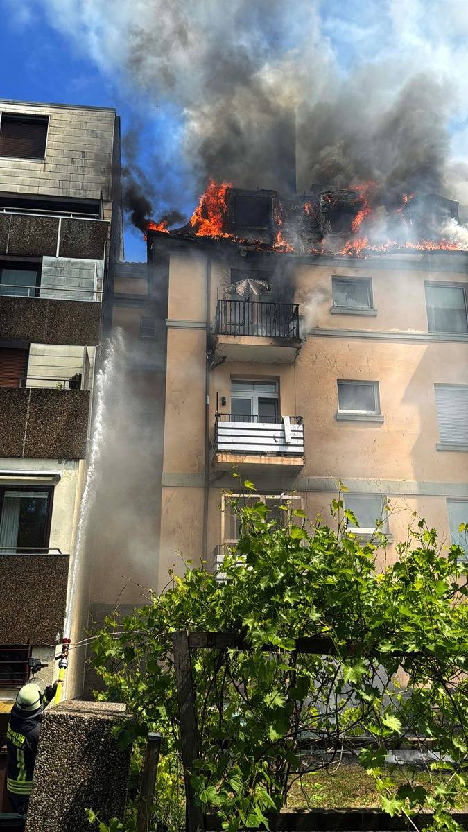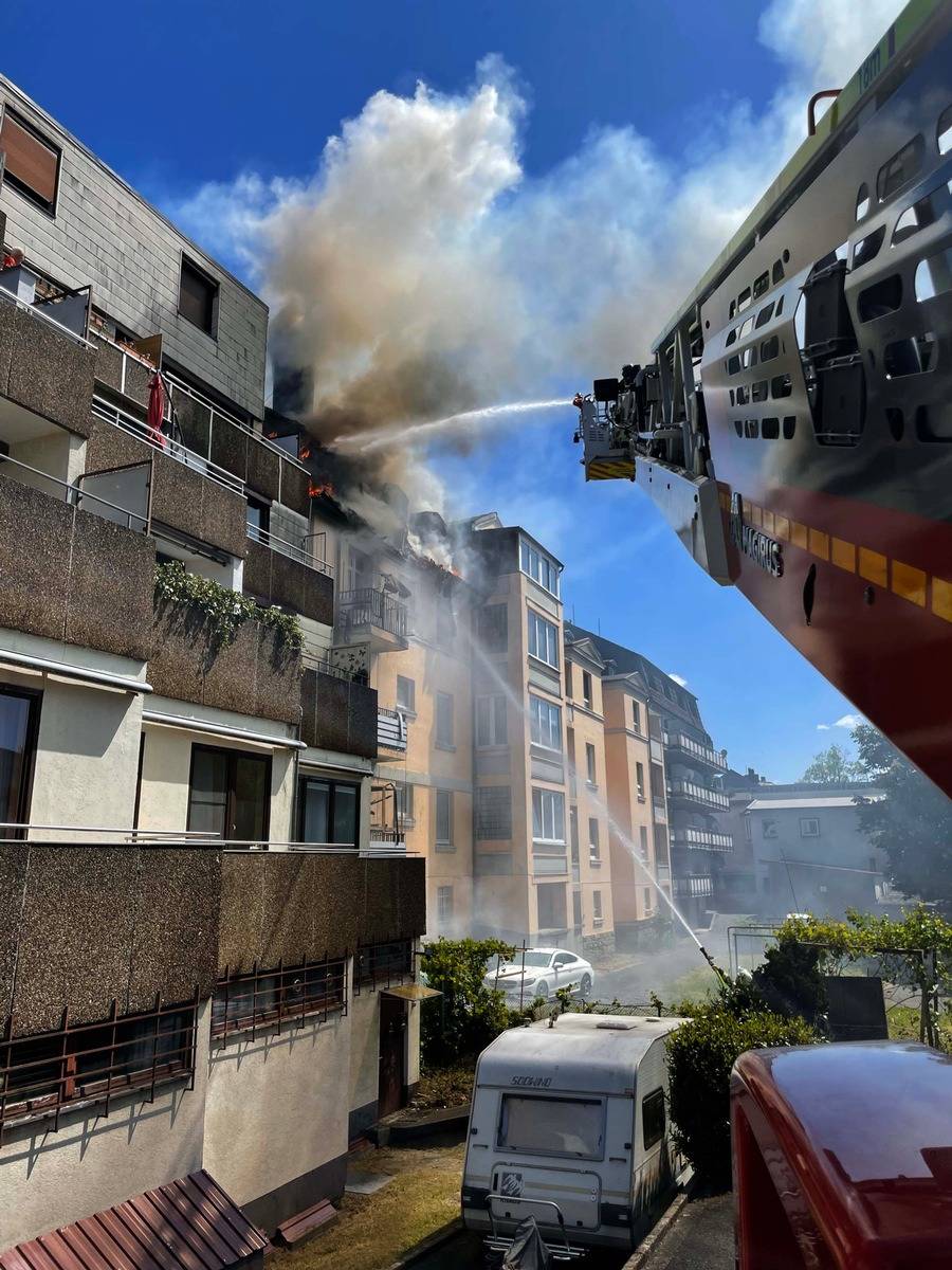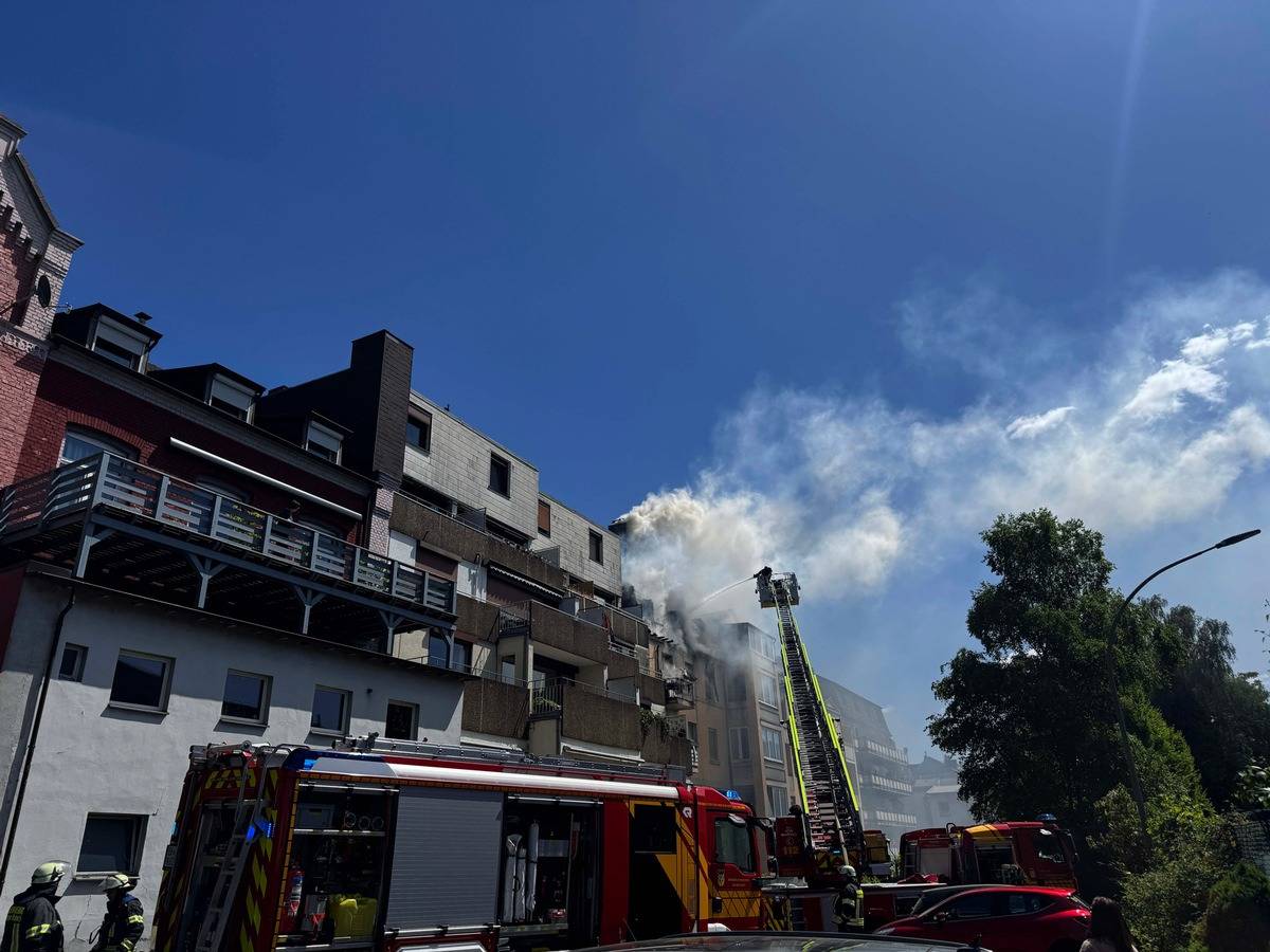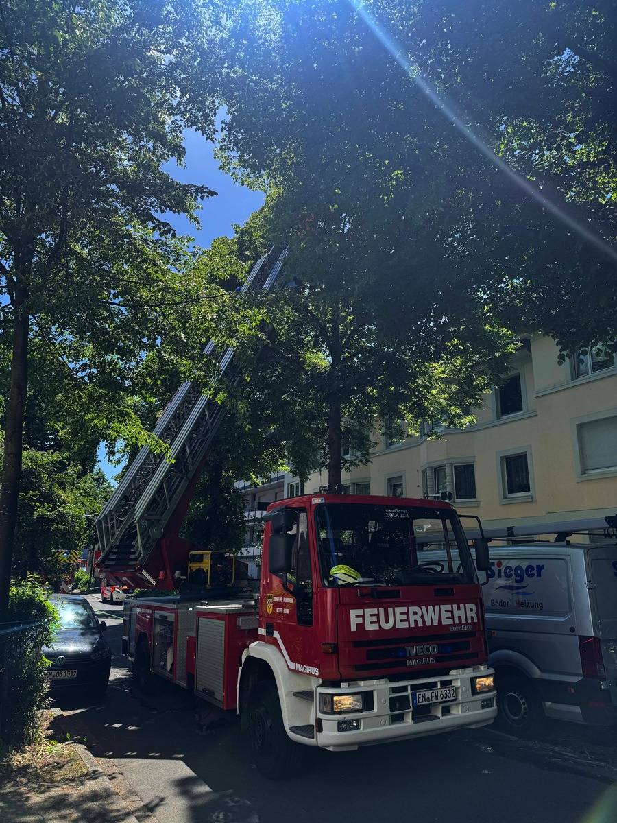 Ein Dachstuhlbrand in der Schöntaler Straße in Wetter hat die Feuerwehr gestern Nachmittag (16.05.) in Atem gehalten. Sie hat mit der Drehleiter zwei Menschen aus der Wohnung gerettet und ins Krankenhaus transportiert. Gegen 13.00 war der Alarm eingegangen.