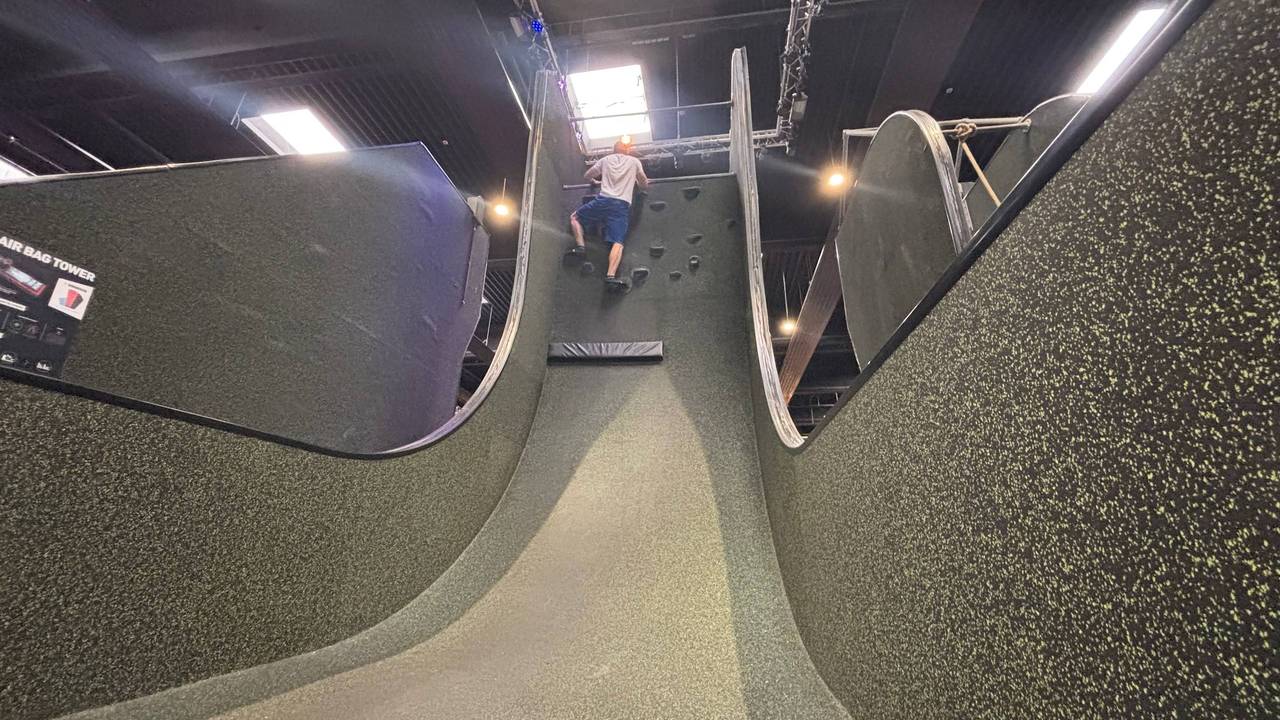 Weiter geht es zur nächsten Station: der Zipline. "Das kenne ich von Kinderspielplätzen", sagt Fassbender, doch Trainer Sascha macht schnell klar, dass es hier nicht ganz so einfach ist. Bevor es losgeht, muss eine Leiter erklommen werden. "Wie hoch ist diese Leiter? Sind das 10 Meter?", fragt der Reporter skeptisch. "Eher dreieinhalb", entgegnet der Trainer schmunzelnd. Oben angekommen, greift Fassbender den Lenker der Zipline. "1, 2, 3, Huiiiiiiiii", ruft er, während er über die Matte gleitet. Unten angekommen, ist er begeistert: "Es ist wie eine Turnhalle für Erwachsene, und es riecht nach Spaß."