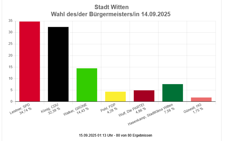 Kommunalwahl Witten: Es kommt zur Stichwahl zwischen CDU-Bürgermeister König & Herausforderer Leistner. Die AfD schneidet in Witten stark ab! Ergebnisse, Wahlbeteiligung und Analyse zur Kommunalwahl in Witten.