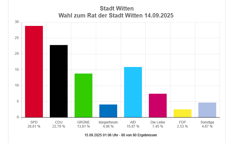 Wie auch landesweit schneidet die AfD in Witten stark ab. Die Partei verzeichnet bei der Wahl des Stadtrates einen satten Zuwachs an Stimmen: Sie hat sich fast verdreifacht und kommt auf 15,9 Prozent. Das sind 11,2 Prozent mehr als bei der Kommunalwahl 2020.