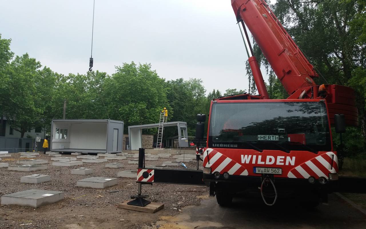 Das besteht aus 128 Containermodulen, von denen die ersten zehn jetzt angeliefert wurden. Drei bis vier Container werden zu einem Klassenraum zusammengesetzt. Das Berufskolleg bekommt unter anderem eine moderne Trinkwasserinstallation, eine angepasste Haustechnik sowie einen verbesserten Brandschutz.