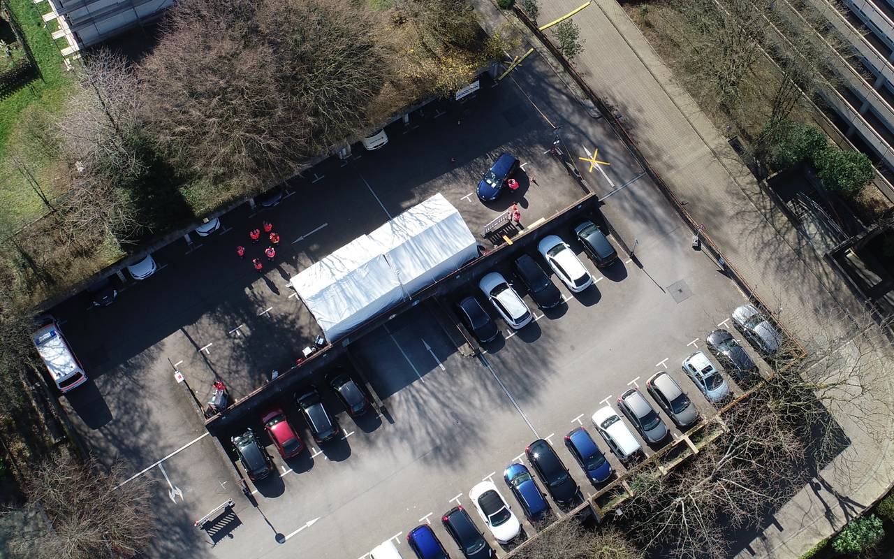 EN: Dazu hat die Kreisverwaltung ein Video gedreht. Eine Mitarbeiterin simuliert eine Bürgerin, die die Diagnosestation in ihrem Auto durchläuft. Die Helfer von THW und DRK spielen ebenfalls mit. Eine Drohne filmt das Ganze aus der Luft. Außerdem gibt es ein Interview mit dem Leiter des Krisenstabes Michael Schäfer. Das Video hat der Kreis auf YouTube gestellt. Der Link dazu: