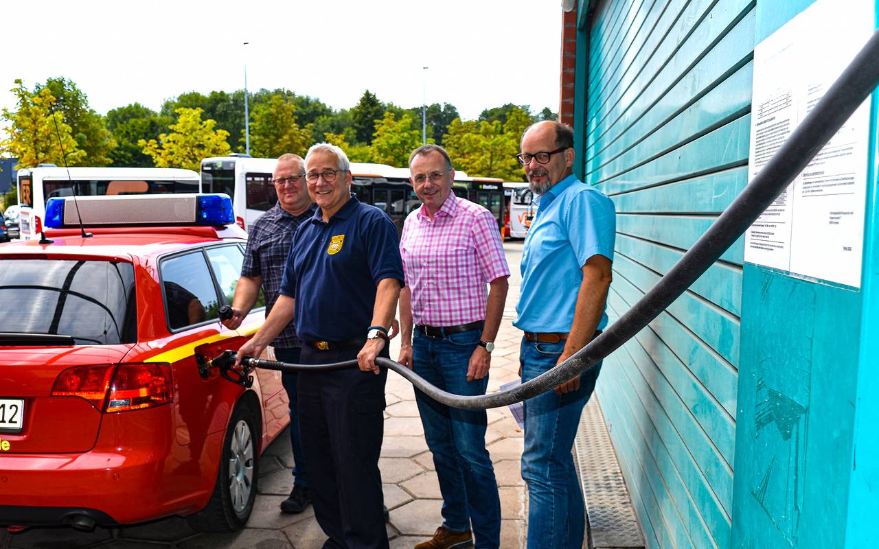 EN: Das Licht geht aus, es kommt kein Wasser mehr aus den Hähnen und auch an den Tankstellen geht nichts mehr: Bei einem flächendeckenden Stromausfall können Rettungskräfte wie die Feuerwehr schnell massive Probleme bekommen. Damit sie auch im Katastrophenfall ausrücken können, arbeitet die Feuerwehr ab sofort mit der Verkehrsgesellschaft Ennepe-Ruhr zusammen. In Zukunft kann sie in solchen Notlagen auf dem Betriebshof der VER tanken – dank Tankchips geht das zu jeder Tages- und Nachtzeit, ohne dass die Nutzung missbraucht werden könnte. Kreisbrandmeister Rehm zeigte sich erleichtert. Im Katastrophenfall sei so eine Zusammenarbeit überlebenswichtig.