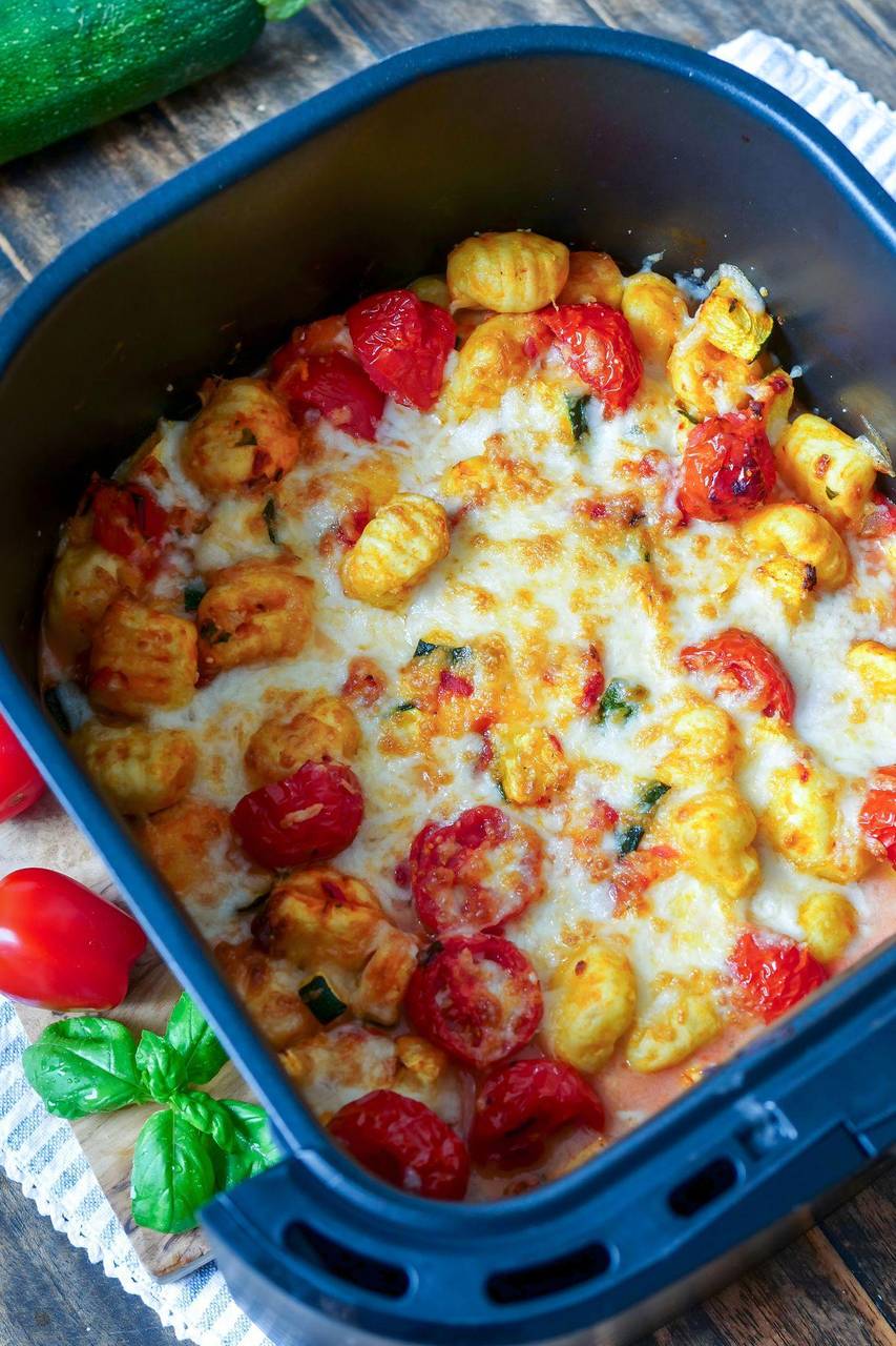 Zu den Lieblingsgerichten von Steffi Sinzenich gehört ein Gnocchi-Auflauf. In den Garkorb kommen die Gnocchi, reichlich Gemüse nach Wahl und eine Sahnesoße – fertig nach einer Viertelstunde im Airfryer. Dazu kommen noch einmal fünf Minuten mit darüber gestreutem, geriebenem Käse. Das Gericht lässt sich auch mit Schinken, Salami und Speckwürfeln kombinieren.