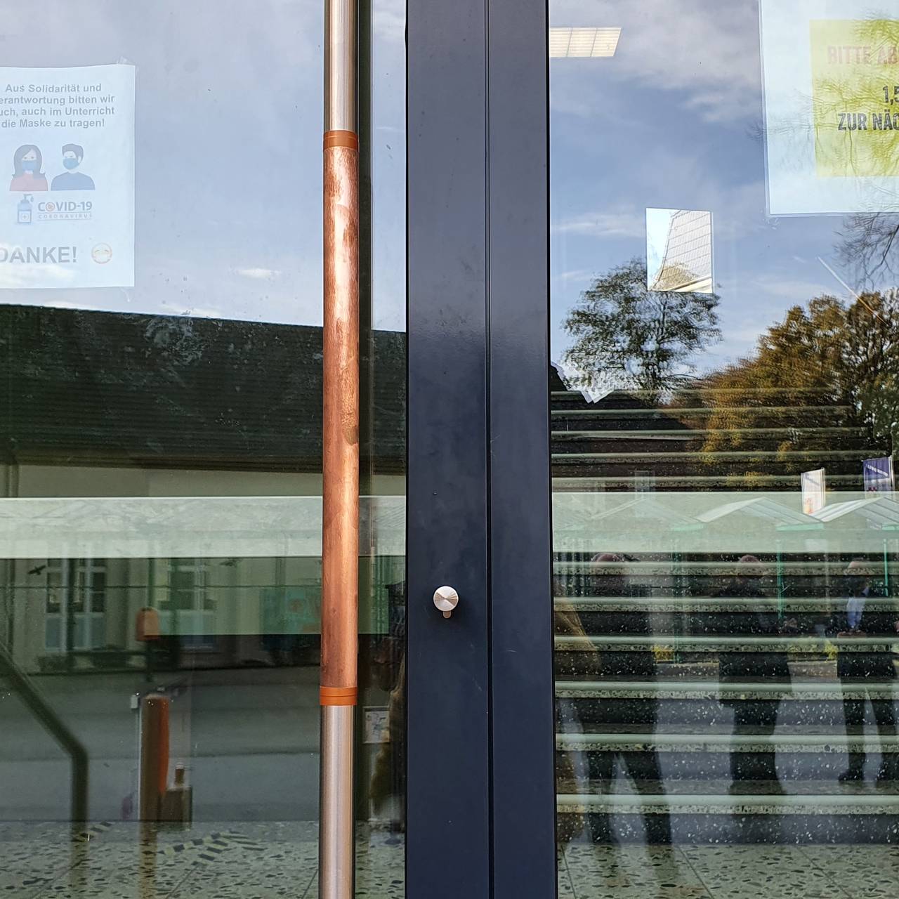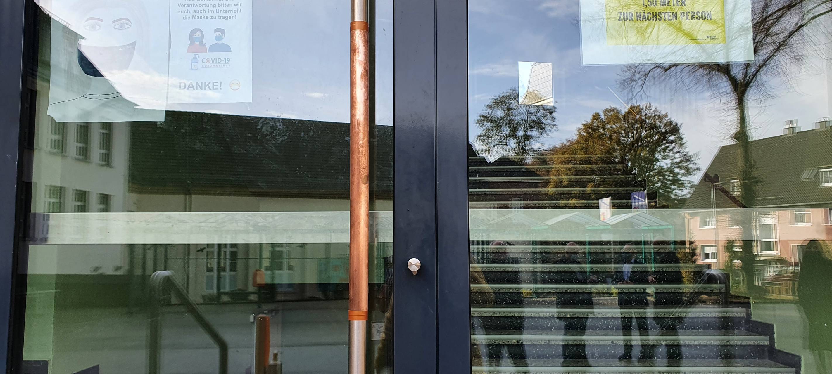 Eine spezielle Kupferbeschichtung soll das Coronavirus in ein paar Stunden deaktivieren. An der Sekundarschule Ennepetal kommt es an zwei Außentüren zum Einsatz.