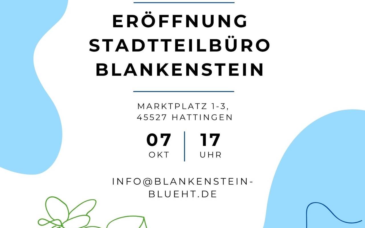 Es ist im Café des Stadtmuseums eingerichtet und öffnet um 17:00 Uhr. Alle Interessierten seien herzlich willkommen, so die Stadt. Seit diesem Jahr ist Blankenstein Projektgebiet des Städtebauförderungsprogramms "Lebendige Zentren". Damit soll der Stadtteil unter anderem auf die internationale Gartenausstellung IGA 2027 vorbereitet werden. Das Büro soll Anlaufstelle für alle Menschen im Stadtteil sein und sie in die Planungen einbinden. Kontakt zum Stadtteilbüro aufnehmen geht per Mail unter info@blankenstein-blueht.de. Nach der offiziellen Eröffnung ist das Büro immer dienstags von 13 bis 15.30 Uhr auf der Empore des Museumscafés Marktplatz 1-3 zu finden.
