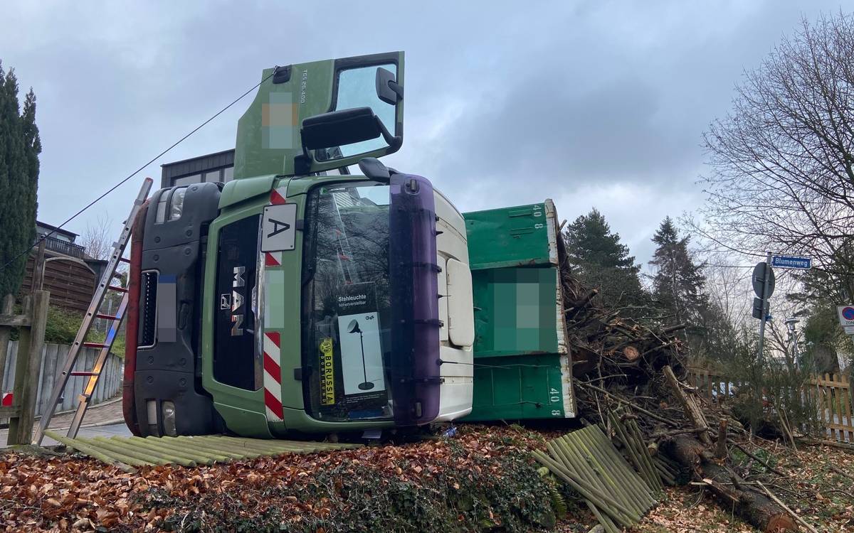 Herdecke: Ein beladener 22-Tonner ist heute am frühen Nachmittag beim Abbiegen vom Waldweg in den Unteren Ahlenbergweg auf die Seite gekippt. Die Ursache ist noch unklar. Die Feuerwehr musste den Fahrer mit einer Leiter aus dem Führerhaus holen. Der Mann blieb unverletzt. Nach anderthalb Stunden war der Einsatz beendet.