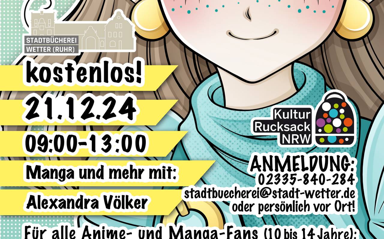 Manga- und Anime-Fans in Wetter sollten sich diesen Termin merken. Am Samstag (21.12.) organisiert die Stadtbücherei Wetter von 9:00 bis 13:00 Uhr einen Manga-Workshop "Christmas Special". Geleitet wird der Workshop von der Comiczeichnerin Alexandra Völker. Eingeladen sind Kinder und Jugendliche im Alter von zehn bis 14 Jahren. Verpflegung und Getränke müssen sie selbst mitbringen. Der Workshop im Rahmen des Kulturrucksacks ist kostenlos, aber eine Anmeldung ist nötig.