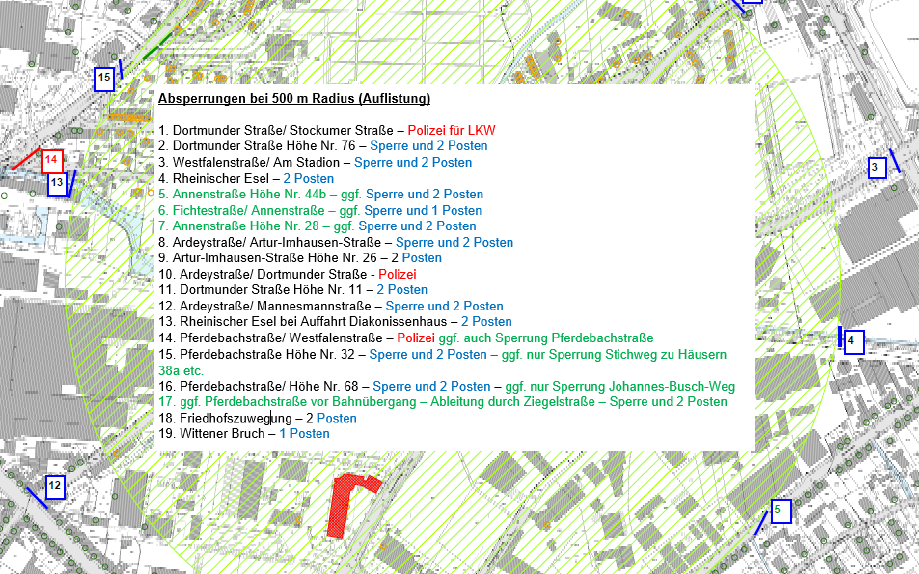 In Witten gibt es einen Blindgängerverdacht. Auf dem Gelände der Stadtwerke an der Westfalenstraße hat es ein Messergebnis gegeben, das in einer Tiefe von anderthalb Metern einen Gegenstand vermuten lässt. Weil es sich bei dem Gegenstand um einen Blindgänger handeln könnte, hat die Bezirksregierung für den kommenden Montag (24.03.) eine Sondierung veranlasst. In den frühen Morgenstunden wird der Gegenstand freigelegt, um überprüfen zu können ob es sich tatsächlich um eine Bombe handelt. Bis das am Vormittag klar ist, müssen sich Anwohner und Betriebe rund um die Westfalenstraße einstellen. Je nach Größe der möglichen Bombe - 250 oder 500 kg - sind Evakuierungsradien von 250 oder 500 Metern geplant.