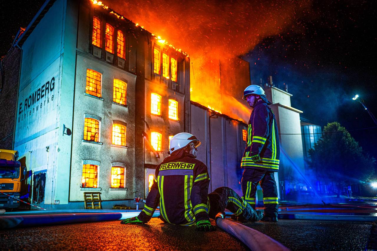 Zwei Feuerwehrleute vor einem brennenden Gebäude. Der eine sitzt erschöpft der andere steht.