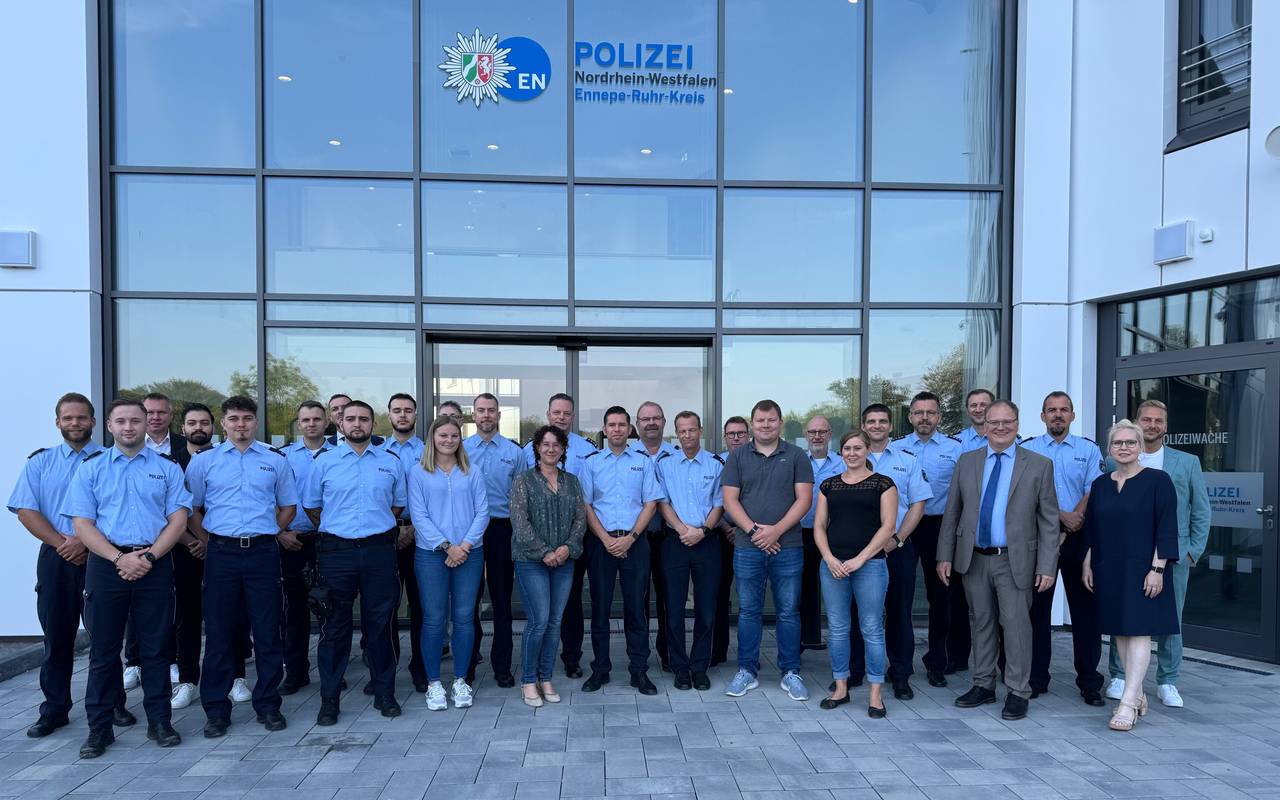 33 neue Polizeikräfte werden ab sofort in unseren Städten unterwegs sein. Sie wurden an der neuen Polizeizentrale in Ennepetal und im Polizeipräsidium Bochum begrüßt. Zwölf neue Beamtinnen und Beamte hat Landrat Olaf Schade bei der EN-Polizei begrüßt. Elf waren in Bochum dabei. Sie werden künftig auf der Wache in Witten ihren Dienst versehen. Von den zwölf Polizistinnen und Polizisten der Kreispolizei werden sieben die Wachen in Hattingen und Ennepetal verstärken - fünf gehen zur Kriminalpolizei. Der große Teil der Neuen hat gerade das Kommissar-Studium an der Polizei-Fachoberschule beendet, die anderen wurden aus anderen Behörden versetzt.