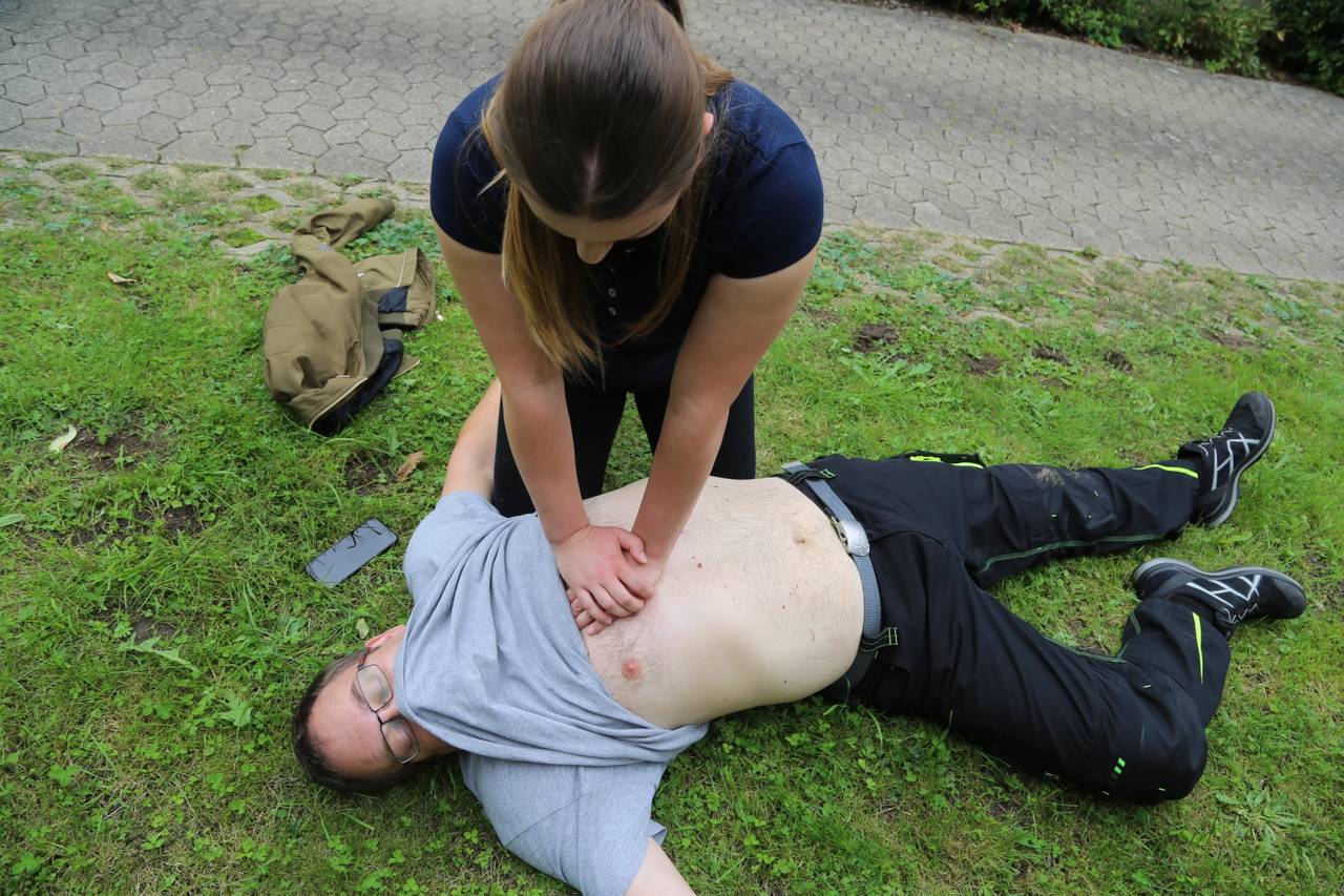 Beobachtet jemand einen Menschen, der in sich zusammensackt, soll er "prüfen", ob der Betroffene auf Ansprache reagiert. Ist dies nicht der Fall, erfolgt der Notruf über die Nummer 112. Danach sollte sich der Ersthelfer seitlich neben den Patienten knien, die Hände verschränkt auf dem Brustkorb aufsetzen und das Brustbein 100-mal pro Minute fünf bis sechs Zentimeter zum Boden drücken. Auf diese Weise wird ein künstlicher Kreislauf erzeugt, der unter den gegebenen Umständen ausreicht, dass ausreichend Blut und Sauerstoff ins Gehirn fließen.