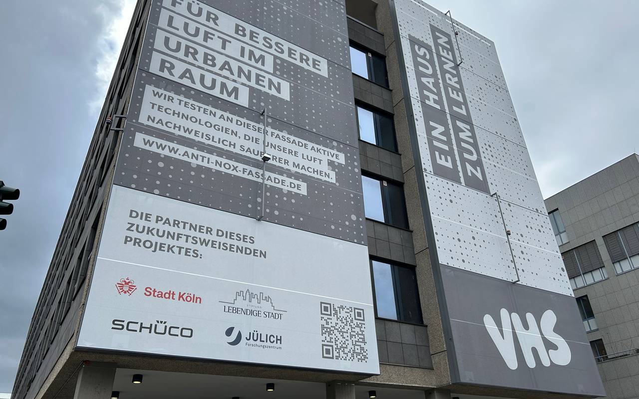Am Gebäude der Volkshochschule Köln wurde eine "stickoxidbindende Textilfassade" installiert. Die Stadt Köln startet mit der Stiftung "Lebendige Stadt" und der Firma "Schüco" hier ein Pilotprojekt. Diese Fassade soll mittels aufgebrachter Wirkstoffe gesundheits- und umweltschädliche Stickstoffe filtern und diese in unschädliche Nitrate umwandeln. Die Verantwortliche erhoffen sich viel.