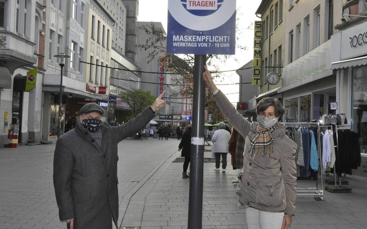 Hattingen: Von montags bis samstags von 7 bis 19 Uhr muss in der Innenstadt ein Mund-Nasen-Schutz getragen werden. Die Stadt hat jetzt neue Schilder aufgestellt, um verstärkt auf die Maskenpflicht hinzuweisen. Außerdem werden noch Symbole auf Böden in der Hattinger Fußgängerzone aufgesprüht, um den Effekt zu verstärken. Das Ordnungsamt läuft zweimal täglich durch die Innenstadt und kontrolliert die Maskenpflicht. Verstöße gibt es nach Angaben der Stadt kaum.