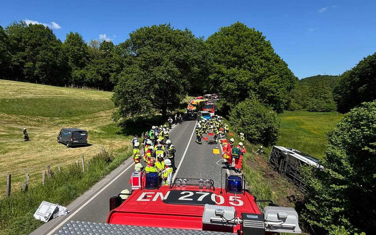 Zehn Menschen sind bei einem Busunfall heute Mittag auf der Haßlinghauser Straße in Sprockhövel verletzt worden. Der Bus war nach einem Zusammenstoß mit einem Lieferwagen von der Straße abgekommen und auf einem tiefer liegenden Feld auf der Seite liege geblieben.