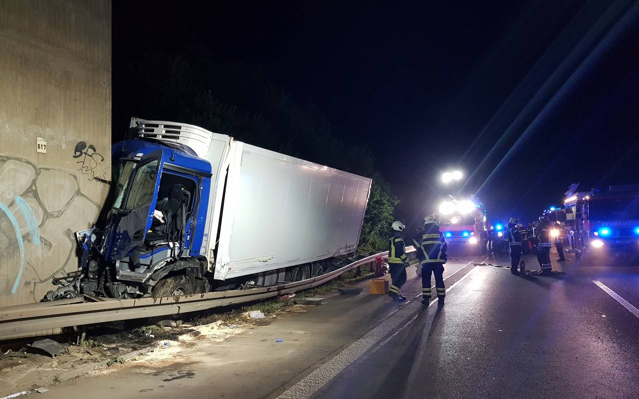 Witten: Die Feuerwehr musste heute Nacht ausrücken, weil ein Lebensmittel-Lastwagen gegen einen Brückenpfeiler geprallt war. Der Fahrer verletzte sich schwer und kam ins Krankenhaus. Durch den Unfall war der Tank des LKW aufgerissen, den Kraftstoff musste die Feuerwehr abpumpen. Erst heute am frühen Morgen war der Einsatz beendet.