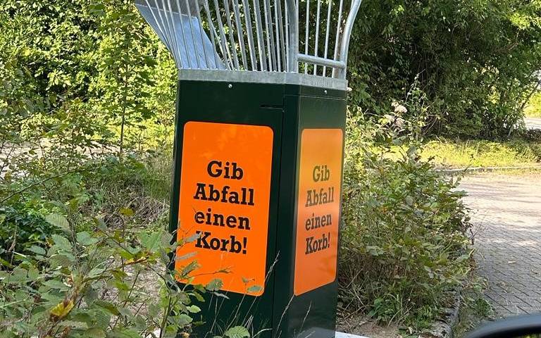 Die Stadt hat einen aufgestellt, auf dem Parkplatz an der Werkstraße direkt neben dem Kreisverkehr. Am Parkplatz und in der Unterführung liege immer viel Müll, so die Stadt. Der neue Mülleimer sollen ein Hingucker sein, denn er sieht ein bisschen so aus wie ein Basketballkorb. Er ist so aufgestellt, dass man im Vorbeifahren durch das Autofenster oder vom Fahrrad aus Müll dort einwerfen könne, so die Stadt.