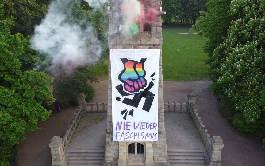Witten: Es handelt sich um eine Gruppierung, die in Anlehnung an Widerstandsgruppen aus der NS-Zeit gegen den Faschismus kämpft. Am Wochenende protestierte die Gruppe am Bergerdenkmal in Witten. Sie haben ein Video veröffentlicht, das Radio Ennepe Ruhr vorliegt. Darin zu sehen sind sechs maskierte Menschen, die ein Protestplakat mit dem Schriftzug "Nie wieder Faschismus" besprühen - später laufen sie durch den Hohenstein-Wald und hängen das Plakat am Bergerdenkmal auf und entzünden ein Leuchtfeuer. Die Polizei wirft der Gruppe Hausfriedensbruch vor. Außerdem wurde der Staatsschutz eingeschaltet, weil die Aktion eine politische Verlautbarung war. Die Polizei versucht jetzt, Hinweise auf die Identität der Gruppenmitglieder zu erlangen.