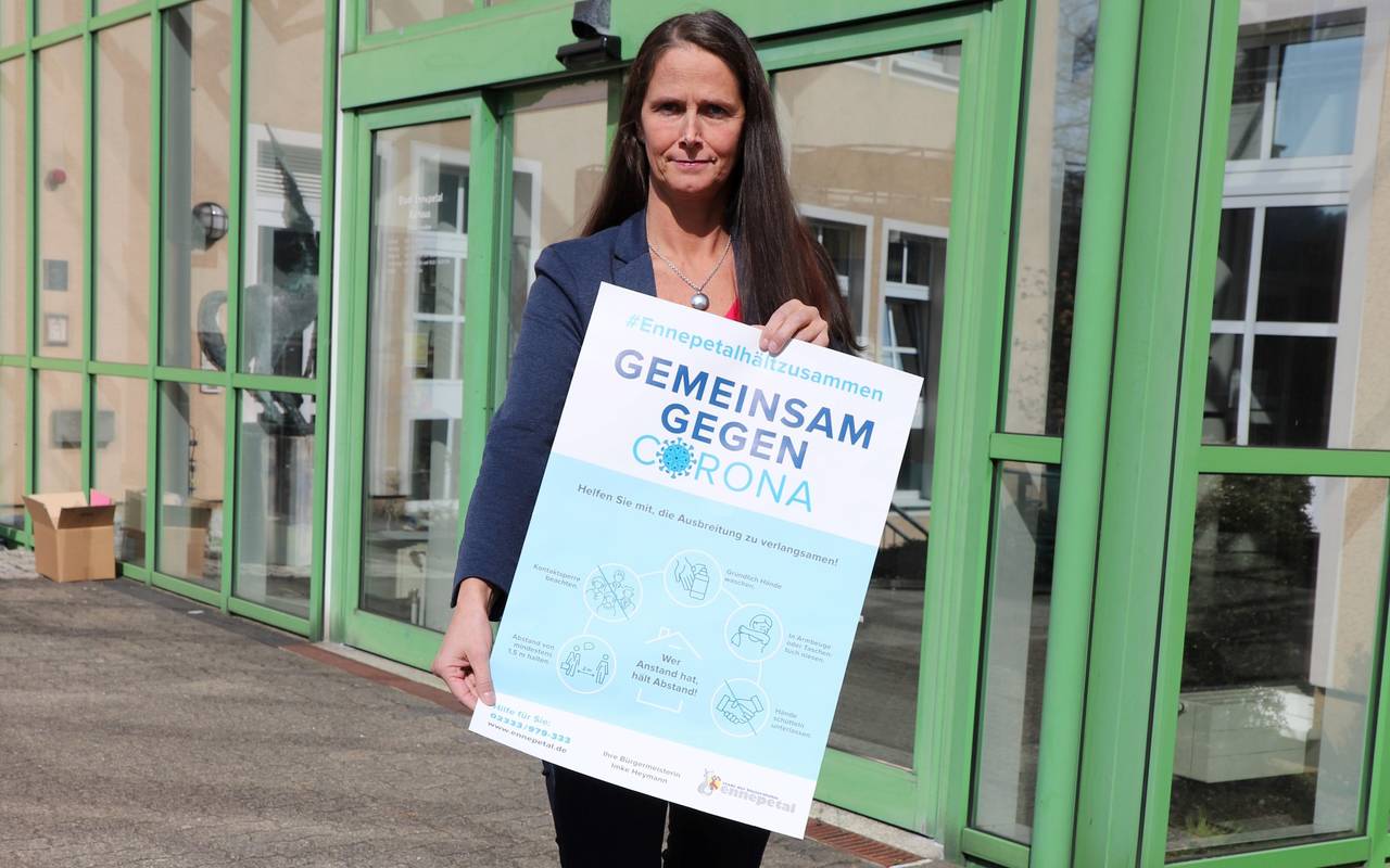 Ennepetal: Sie appeliert damit an die Vernunft. Die Ausbreitung des Corona-Virus kann nur verlangsamt werden, wenn sich jeder an wichtige Grundregeln hält. Diese hat die Stadt auf Plakate drucken lassen, die jetzt überall aufgehängt werden. Das Motto ist"#Ennepetalhältzusammen". Bürgermeisterin Imke Heymann ruft dazu auf, zu Hause zu bleiben und Sozialkontakte zu meiden. Das müsse immer und immer wieder ins Gedächtnis gerufen werden. Heymann liegt es am Herzen, gemeinsam zu versuchen, die Krise erfolgreich zu beenden.