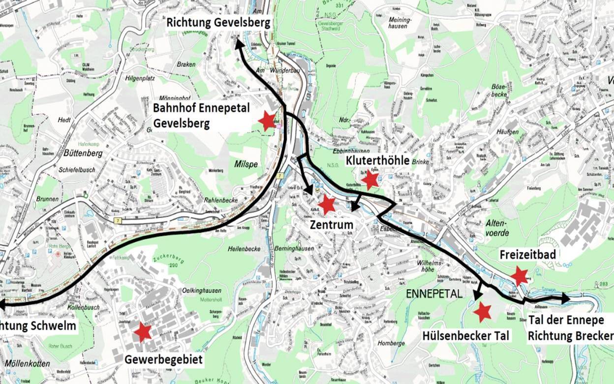 Ennepetal: Die Stadt sieht das auch als wichtigen Baustein des Klimaschutzkonzepts. Vertretern des Landesbetriebs Straßen NRW hat sie ihre Pläne kürzlich vorgestellt. Vorgesehen ist eine Alternativstrecke zur stark befahrenen Kölner Straße entlang den Bahngleisen.