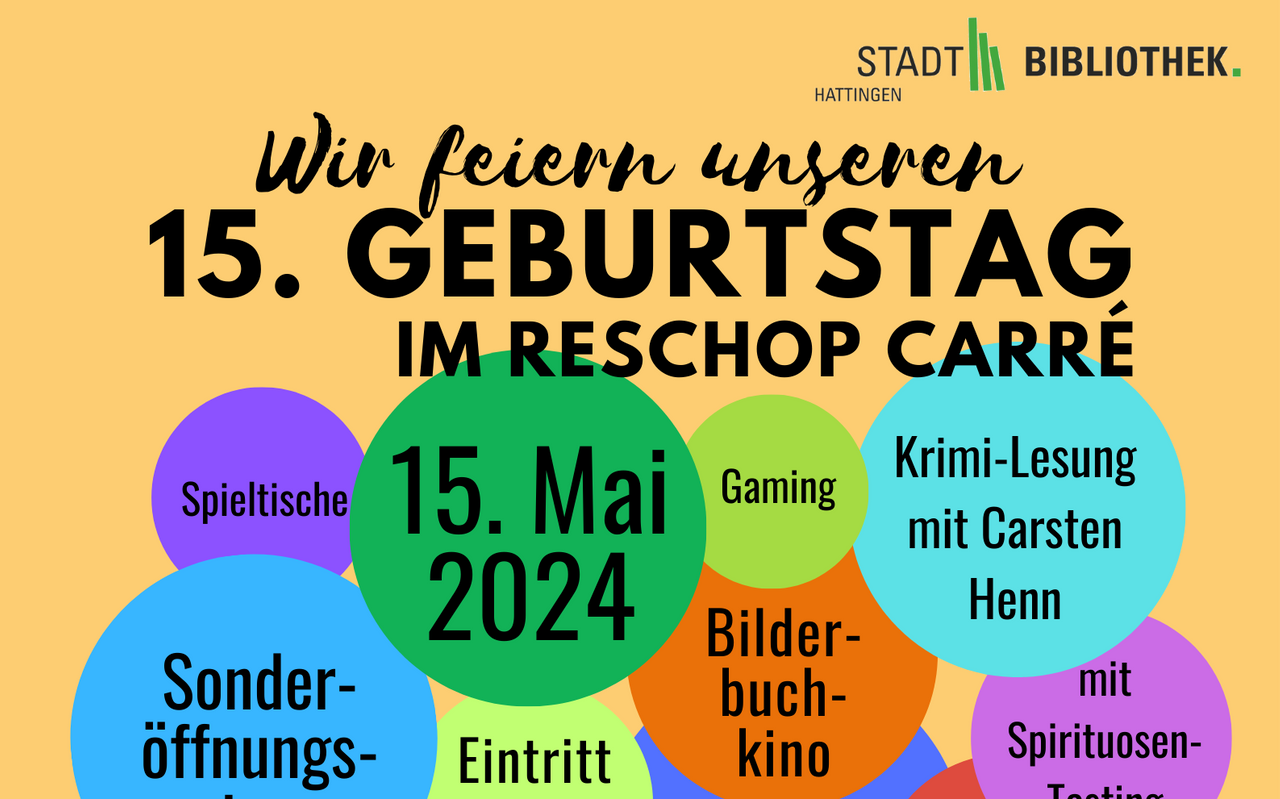 Seit 15 Jahren hat die Hattinger Stadtbibliothek ihr Zuhause im Reschop Carré. Das feiert sie morgen (15.05.) mit einem Aktionstag. Der Umzug und die Ausweitung des Angebots haben sich offenbar gelohnt. Rund 117.000 Besucherinnen und Besucher haben sich vergangenes Jahr fast 219.000 Medien ausgeliehen. Dazu gehören neben Büchern und Spielen auch digitale Angebote. Um 14:00 Uhr geht´s am Aktionstag los. Dann präsentiert die Bibliothek alle Angebote und zeigt ein buntes Programm. Ab 18:30 Uhr gibt es eine Krimi-Lesung mit Spirituosen-Verkostung. Das ist zwar kostenlos, die Stadt bittet aber um eine Anmeldung.