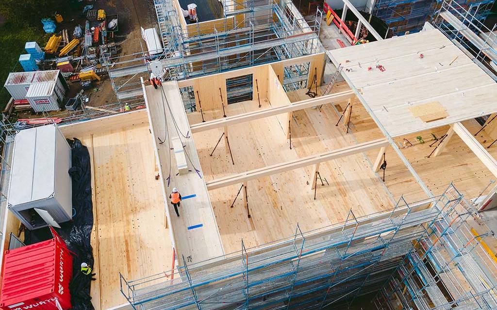 Das Großprojekt in sogenannter Holzhybridbauweise wird mit seiner Fertigstellung nächstes Jahr zu den größten Hochschulgebäuden seiner Art in NRW zählen. Es werden 1.200 Kubikmeter zertifiziertes Fichtenholz aus nachhaltiger Forstwirtschaft und rund 10.000 Holzbauelemente verbaut.