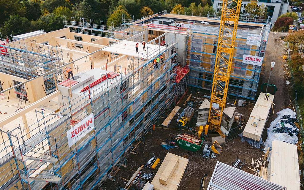 Witten/Herdecke: Mit der Dachlegung werden heute die Holzbauarbeiten am neuen Seminar- und Bürogebäude der Privatuni abgeschlossen.