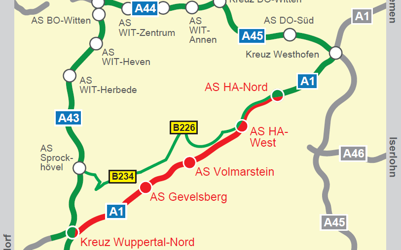 EN: Auf der Autobahn 1 stehen vom 30. August bis zum 2. September umfangreiche Arbeiten an. Die Sperrung gilt dann zwischen dem Kreuz Wuppertal-Nord und Hagen-West in beiden Richtungen.
