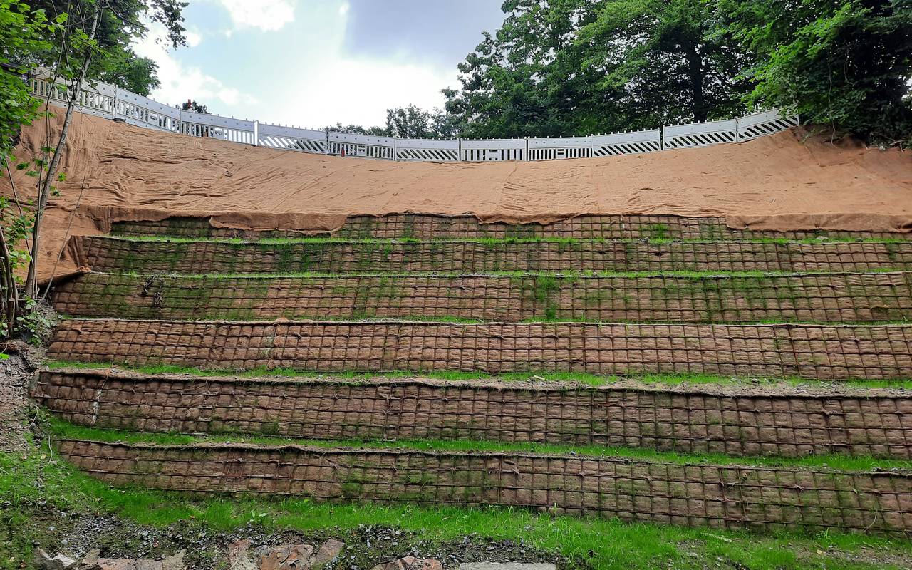 Der konnte jetzt deutlich vor dem geplanten Abschluss fertiggestellt werden. Um den Hang wieder aufzubauen, hat die beauftragte Firma 2.000 Tonnen Boden bewegt. Anschließend hat sie die Böschung mit speziellen Riesel- und Errosionsschutzmatten eingedeckt. Die Maßnahme hat knapp eine Viertelmillion Euro gekostet.